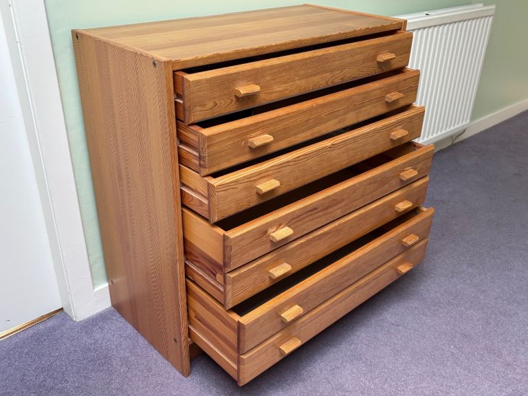 Five drawer (IKEA?) pine chest of drawers (3 single plus 2 deep drawers) in OK functioning condition thus price. Measure 80cm wide x 40cm depth x 81cm high.