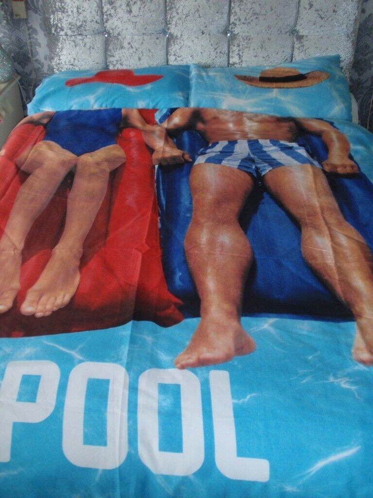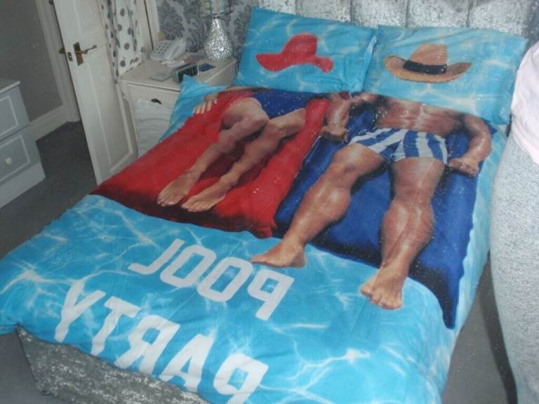 Funny double duvet cover set featuring man and woman sunbathing on lilo's.