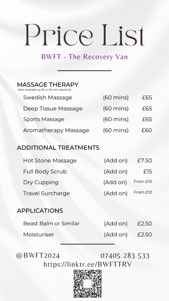 We are happy to bring 'The Recovery Van' as close to you as parking will allow. We can travel within a 10-mile radius to bring bespoke and tailored relaxation and relief to your doorstep. If you require services beyond this radius, we can discuss this on an individual basis. No where to park? Don't worry, you can meet us at an agreed location!