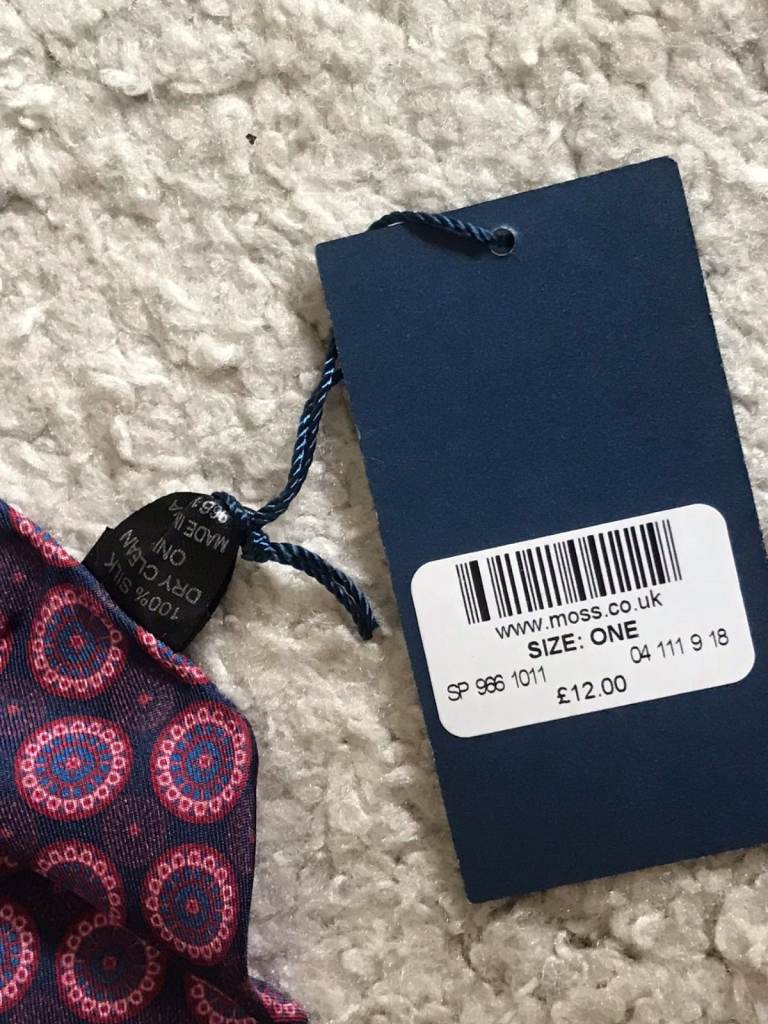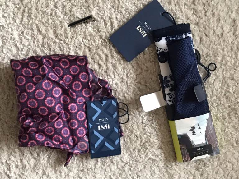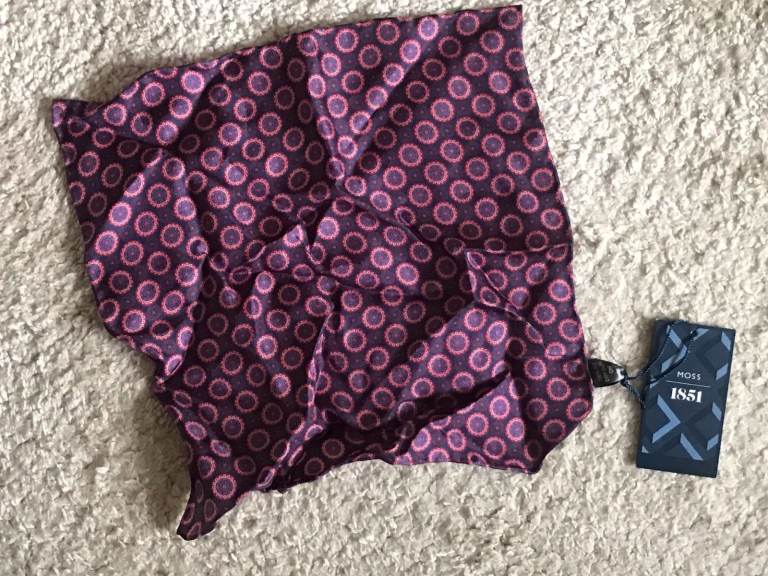2 pocket squares never used, one pocket square used once, and tie bar clip used on a small handful of occasions so in excellent condition.