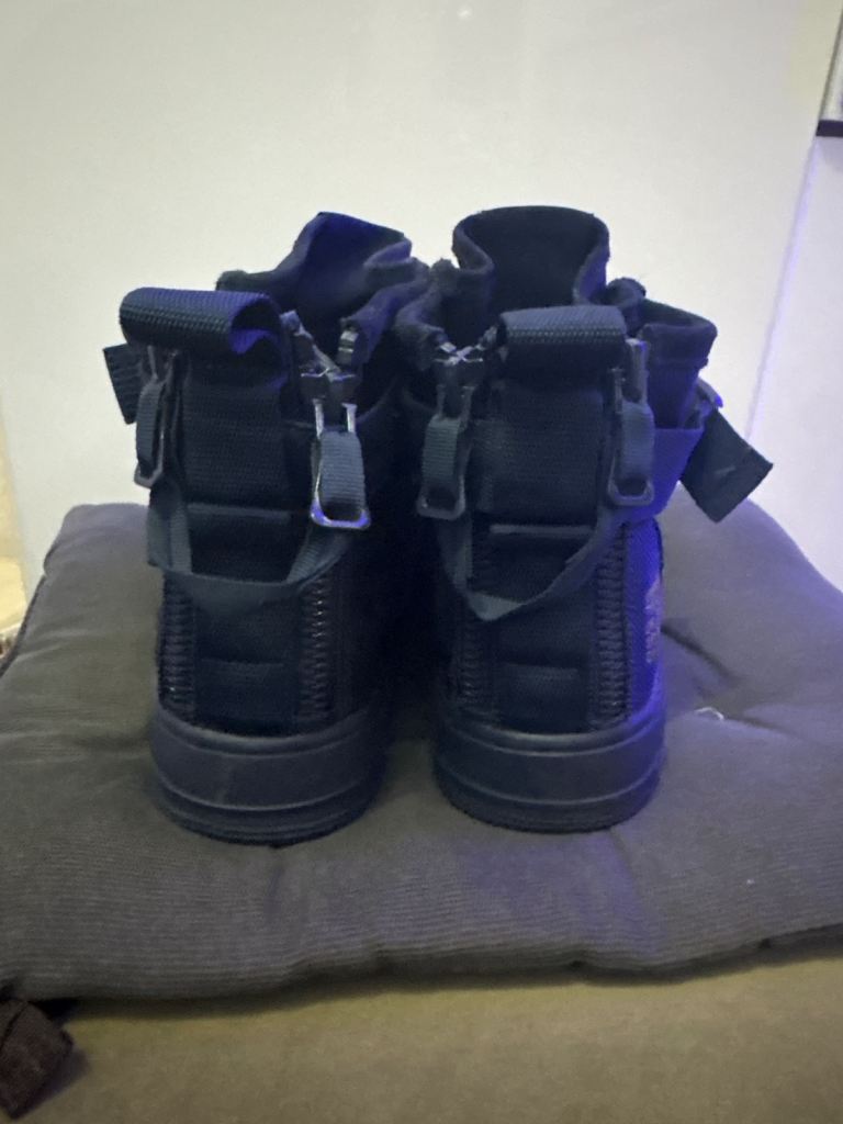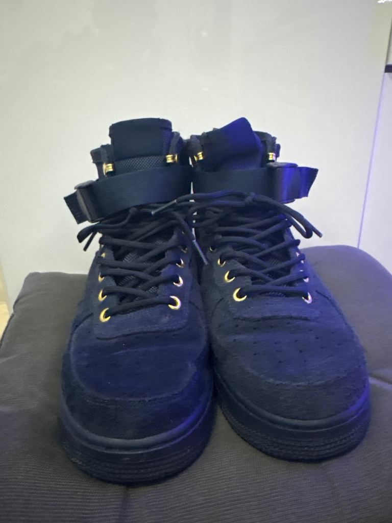 Air force 1 size 7 in navy blue bought a while ago for 100 barely worn box was damaged so I have no box for them