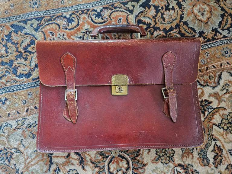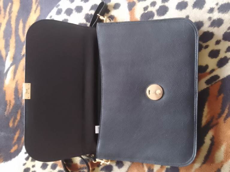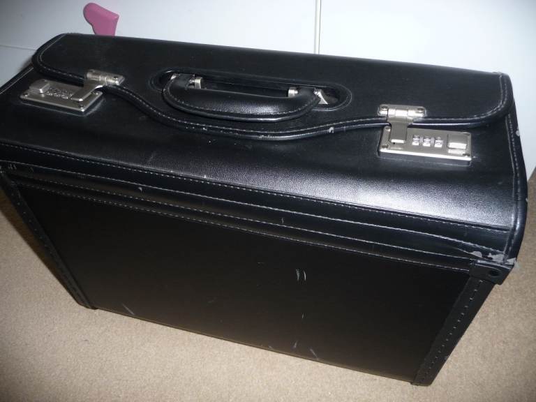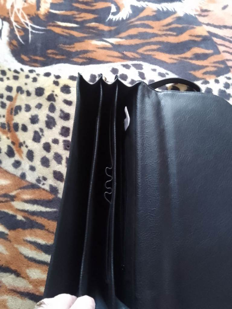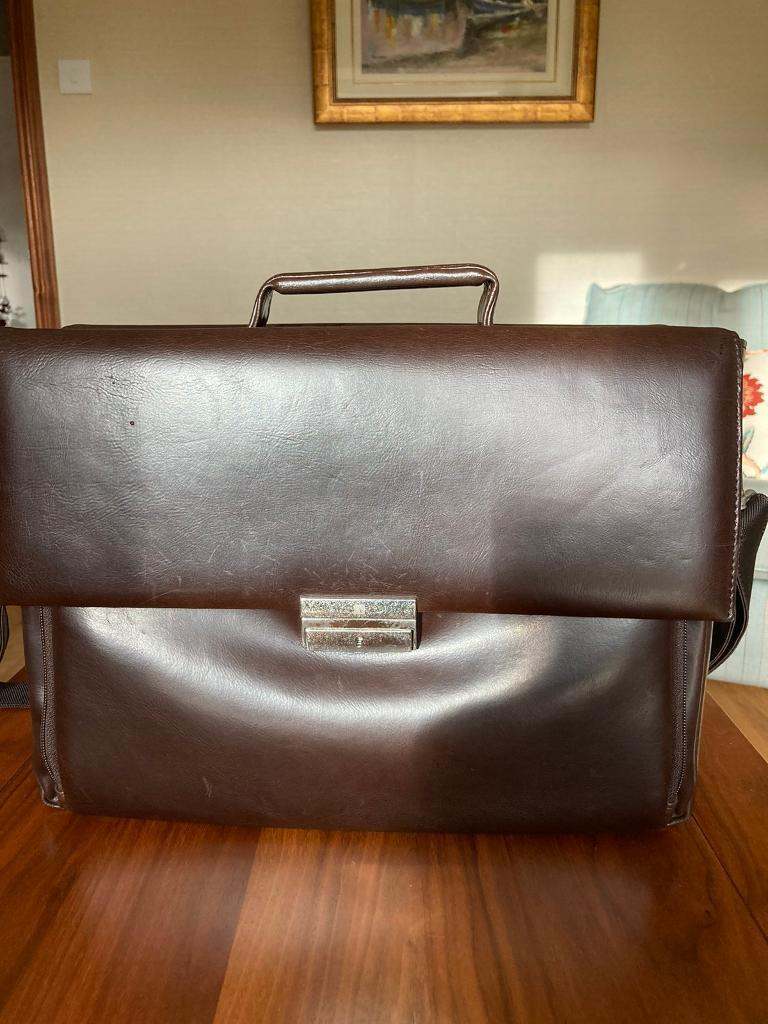Black Faux Leather Ladies Briefcase/Bag, with carry handle and detachable shoulder strap. 3 sections, internal zip pocket area, place for 3 pens. Never used, very good condition. It is a St. Michaels (M & S) bag.