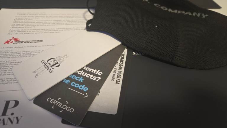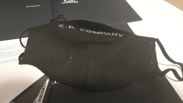 crafted in Dryarn® fabric with C.P. Company branding on the front. It has loops on each side made of the same material to go over the ears. The mask is single-layered.