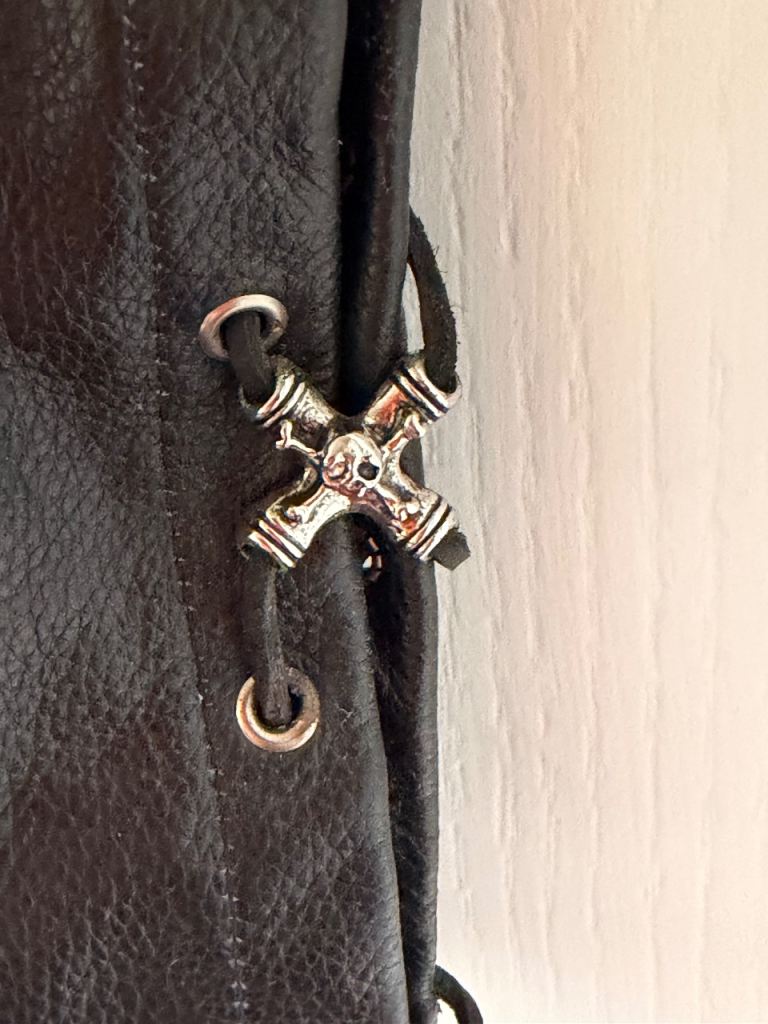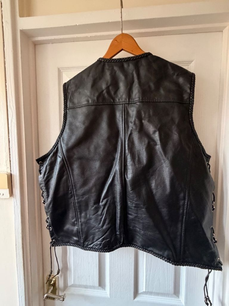 This Waistcoat is size 4xl but I would say it fits from 56 Eu to anything just above 60Eu if you extend it on its sides it’s got scull and crossbones on the side laces and has inside pockets as well as outside pockets it’s quilt lining makes it warm against a T-shirt it’s very comfortable to wear I have included a new Ace Cafe Patch with it I can post this out but you will have to pay for the additional cost of shipping .