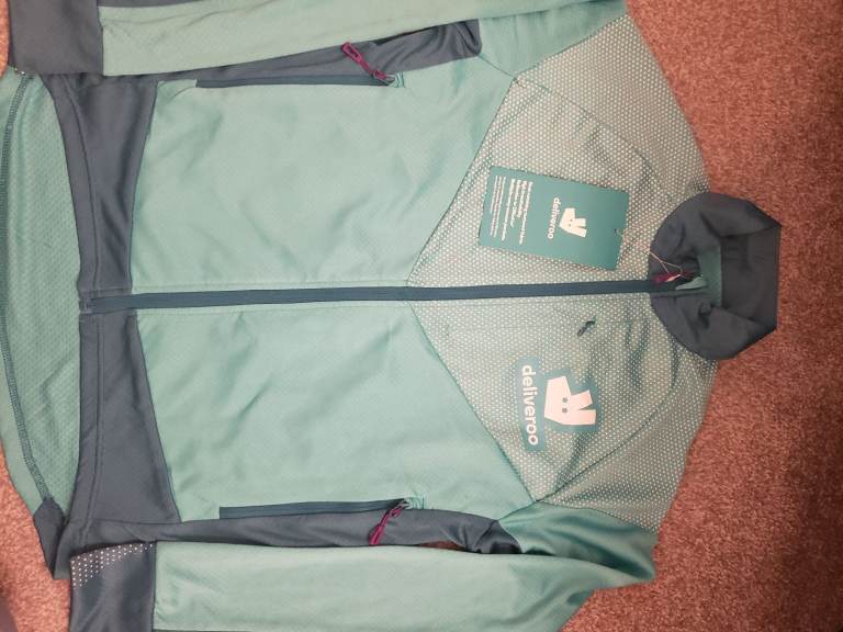 The Deliveroo Adult Long-Sleeved Zipped Jacket in size medium is a new tags windbreaker designed for unisex adults. Made from softshell polyester material, this mid-length jacket features a full zip closure, reflective accents, and the brand's logo. Ideal for workwear or outdoor activities like walking and cycling, this turquoise jacket is a stylish option for all seasons.