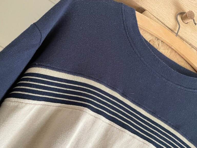 Good quality men's WPS crew neck, short sleeve, navy & beige stripe , cotton t-shirt in pure heavyweight 100% cotton for a premium look ,and a substantial feel. Easy regular fit. Size M - L ( marked Large, but looks more like Medium). Machine washable. Used, but good condition, and ideal for Summer!
