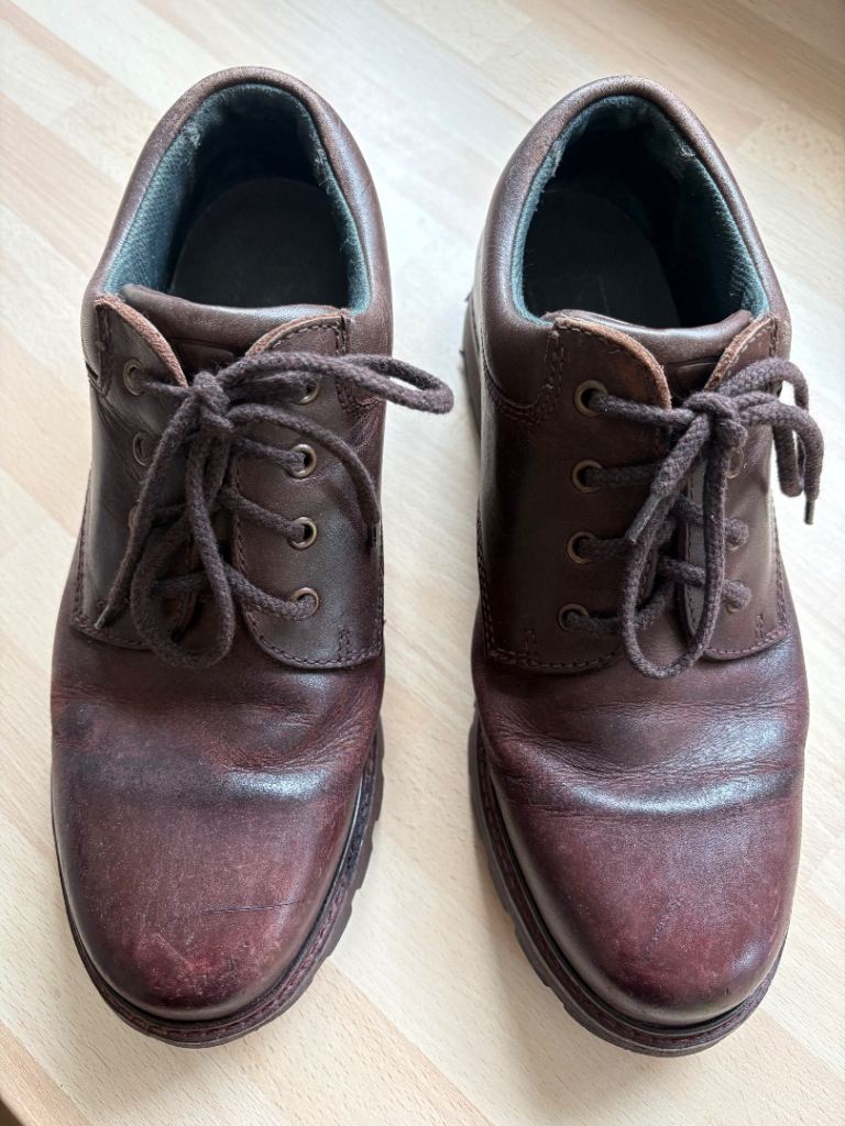 UK size 9. They have water resistant black Leather Polyurethane uppers & Rubber Polyurethane soles.