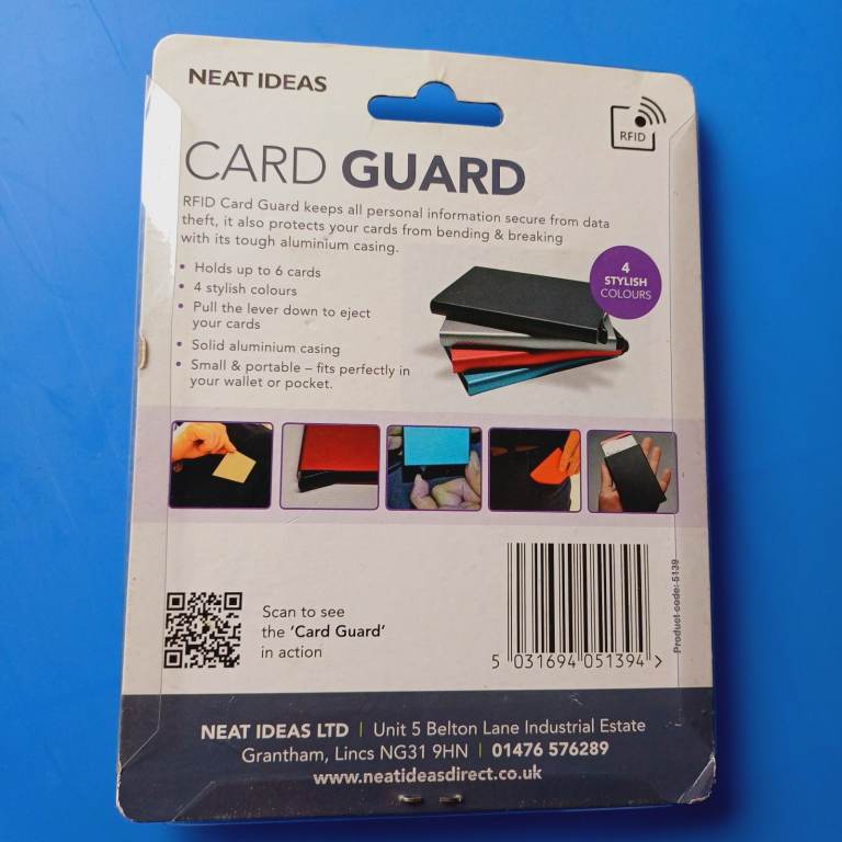 Blue solid aluminium debit / credit card holder (guard) holds up to 6 cards.