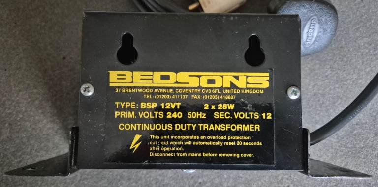 A used Bedsons BSP 12VT 240v 2 x 25 Watt 12v AC output continuous duty transformer for handlamps / worklights...