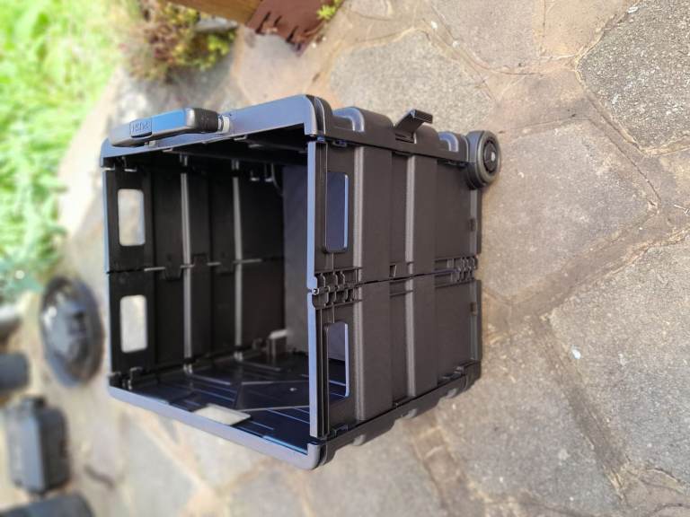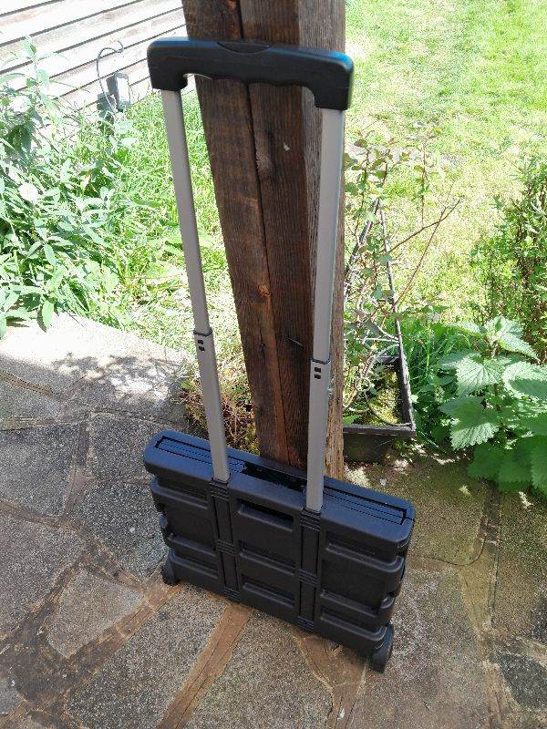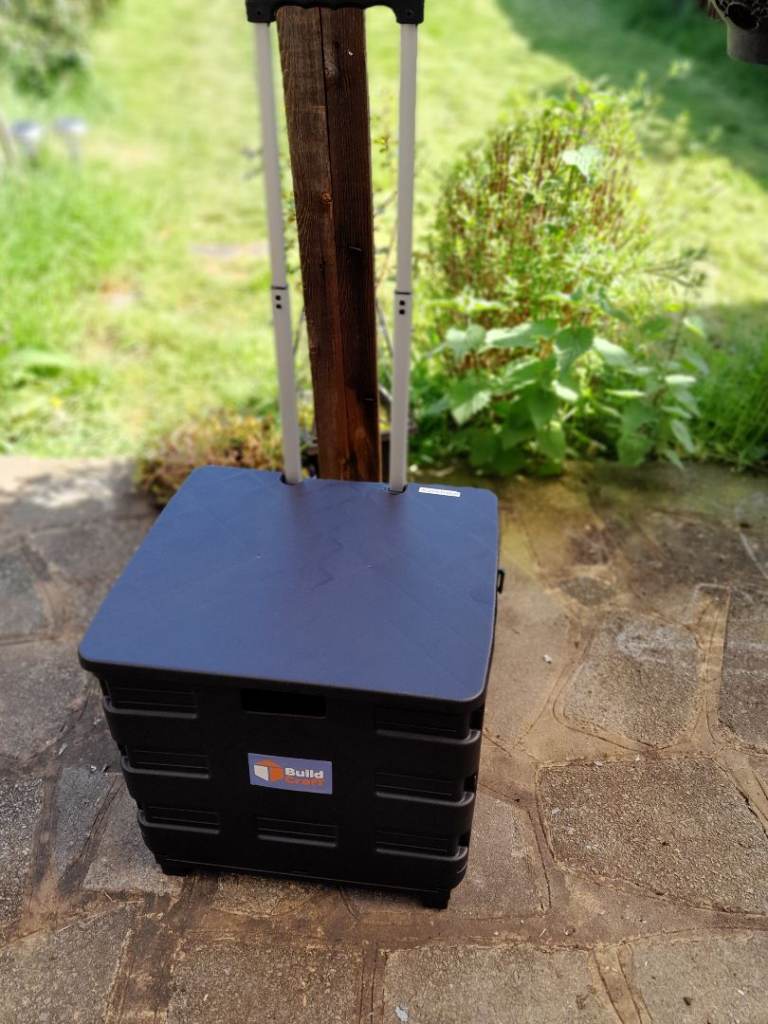 Buildcraft Folding Cart, designed to carry up to 35kg of your garden essentials with ease, or tools. The cart features a robust silver iron handle and is crafted from recycled PP, ensuring durability and sustainability. Its foldable design allows for compact storage, while the lid offers protection for your items against the elements, making it a practical addition to any garden or working set-up.