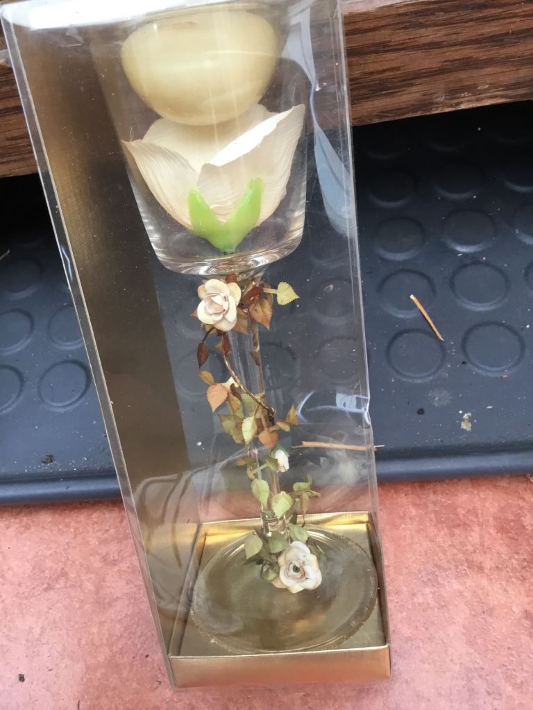 Small candle sat in stem wine glass + décor flowers very pretty -Still in box