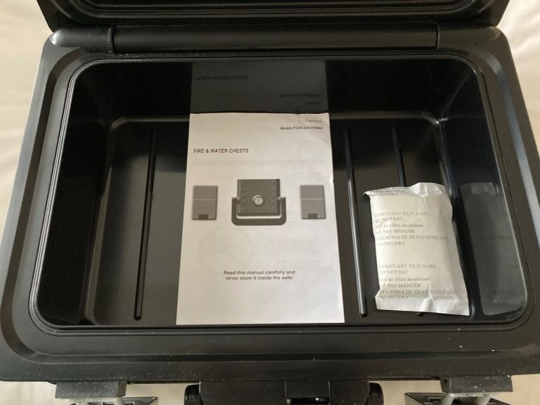Unused black fire and deed box for documents with manual.