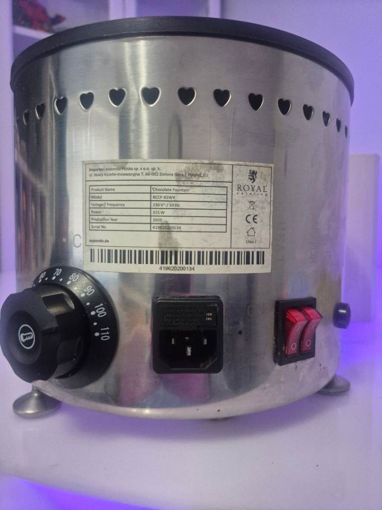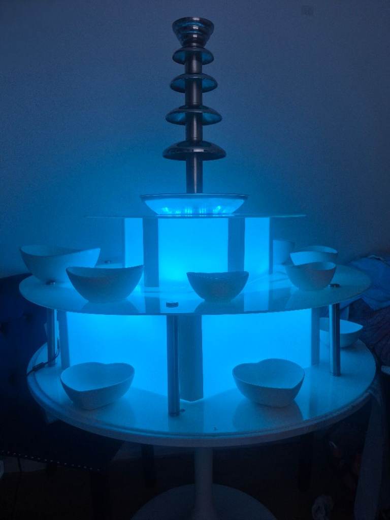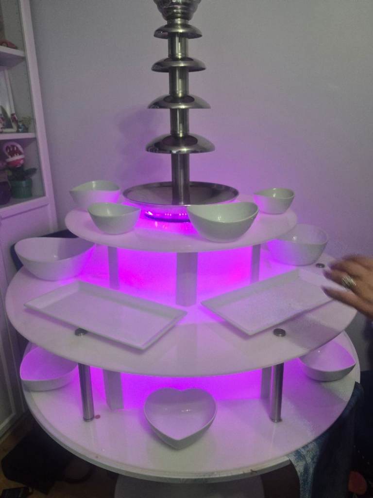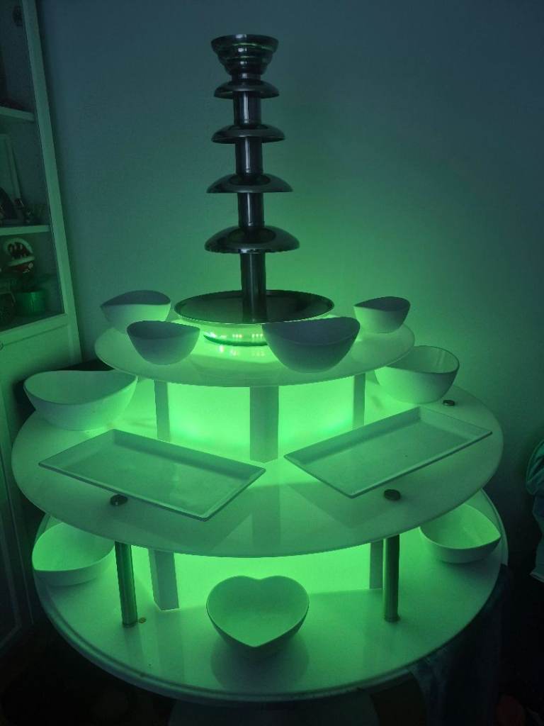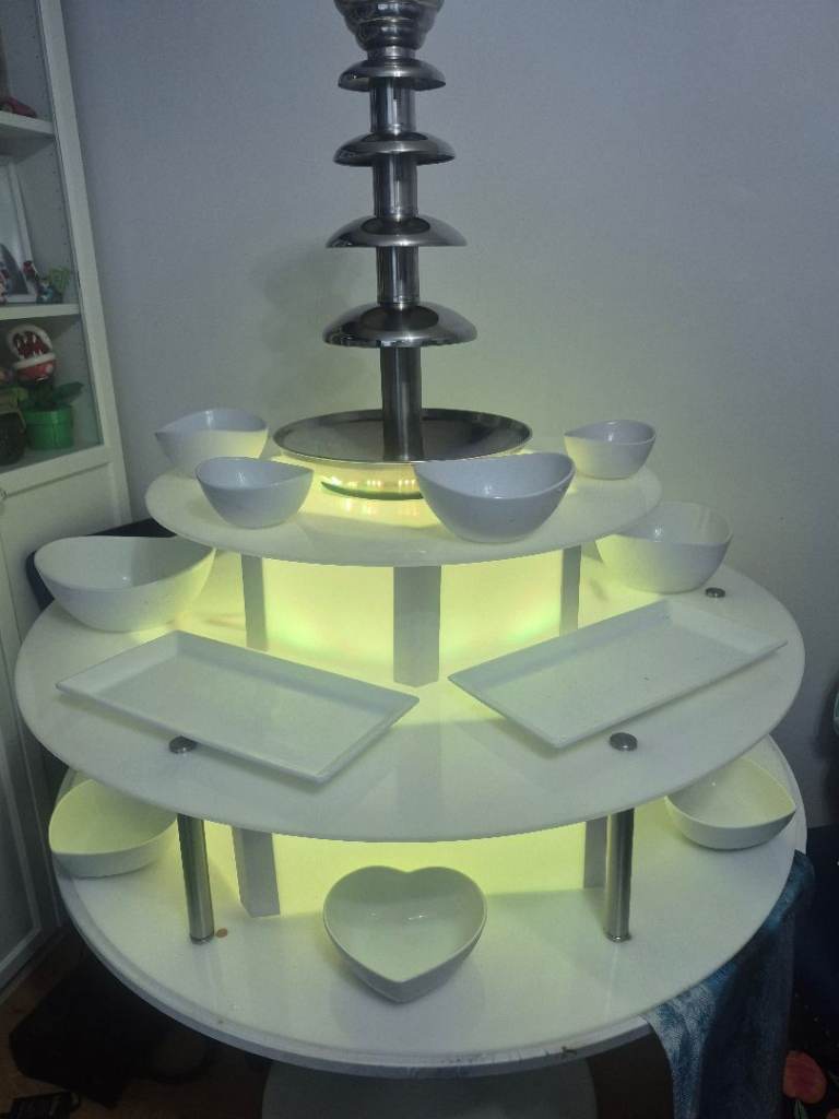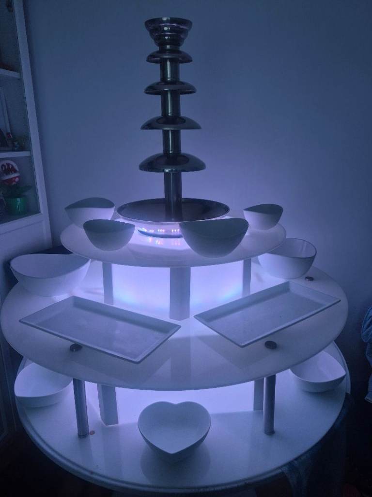 Royal catering commercial chocolate fountain for sale with acryclic 3 tier LED base all working perfectly includes white porceline table wear napkin holder and skewer holder and a few hundred skewers looks stunning fully set up ready for you to hire out straight away just add chocolate. Fountain in original box pick up only from croydon due to size £400 all in no offers