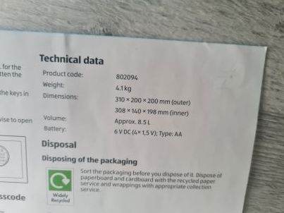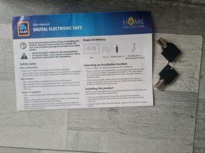 aldi electronic safe. comes with keys and instructions. dimensions as per photo. preowned and used but no longer required. pick up only with cash £20 ONO