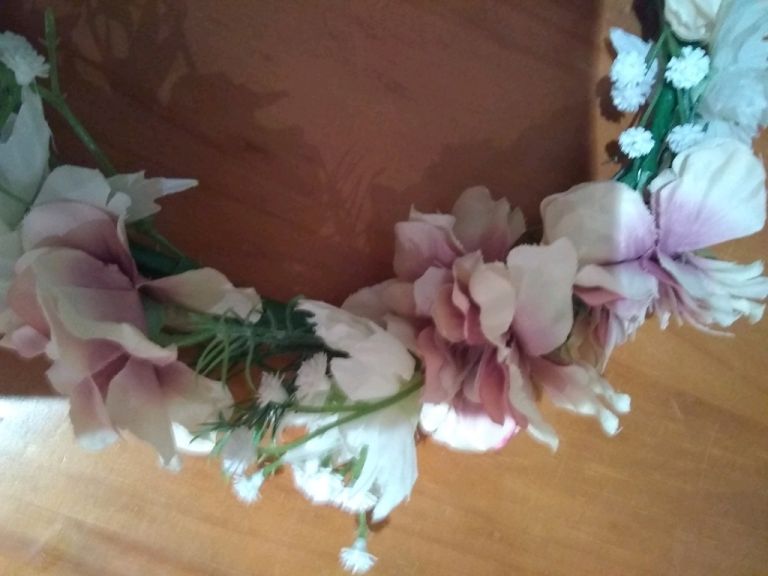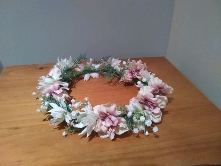 Pretty floral wreath - can be used as headwear (eg. for a child's wedding outfit) or table decoration or something else.... 7 inches inside diameter Excellent condition