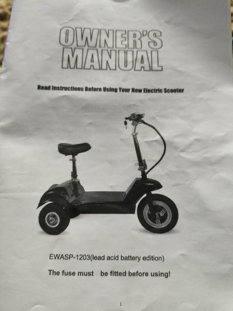 This is being sold for my friend EWASP -1203 (lead acid battery edition) in new condition . Comes with two keys and a full charging battery with charger. Light cover at back falls off but it can be put on and held with a little bit of tape comes with book ,little tool set and charger plus two keys