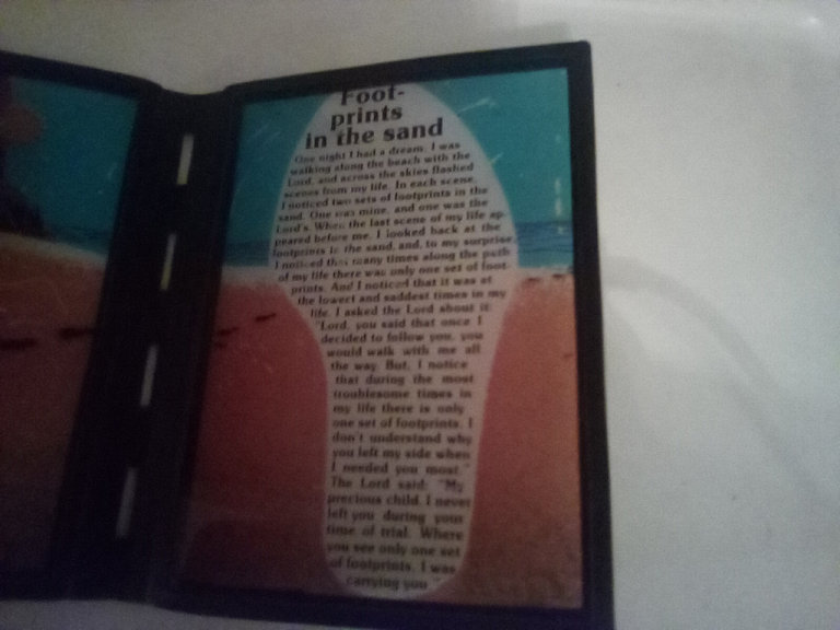 Standing framed stained glass footprints in the sand. Immortal poem by Mary Stevenson. 20 cm long when opened, 12 cm high. Lovely present as excellent condition