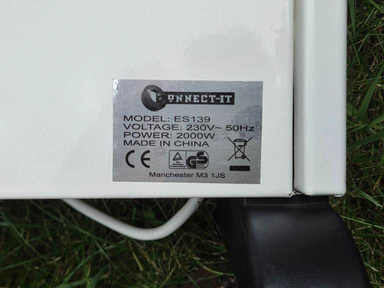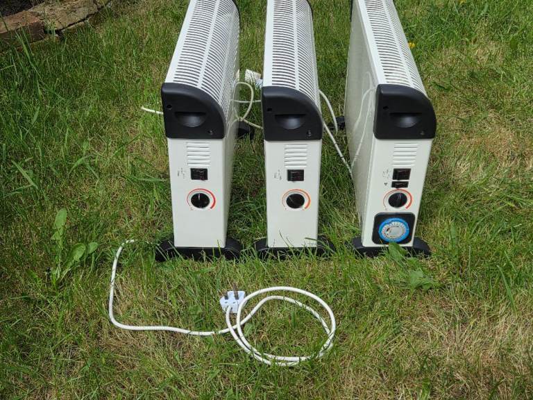 There are x2 ‘Connect-it’ convector heaters & one ‘Focus’ convector with fan & on/off timer setting all with thermostats. They are matching sizes and looks, in very good condition, hardly used – all tested & working. All with 3 heat settings 750w, 1250w & 2000w – 230 volts fitted with standard 13amp household plugs.