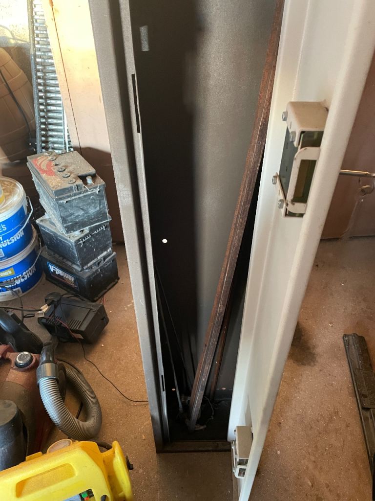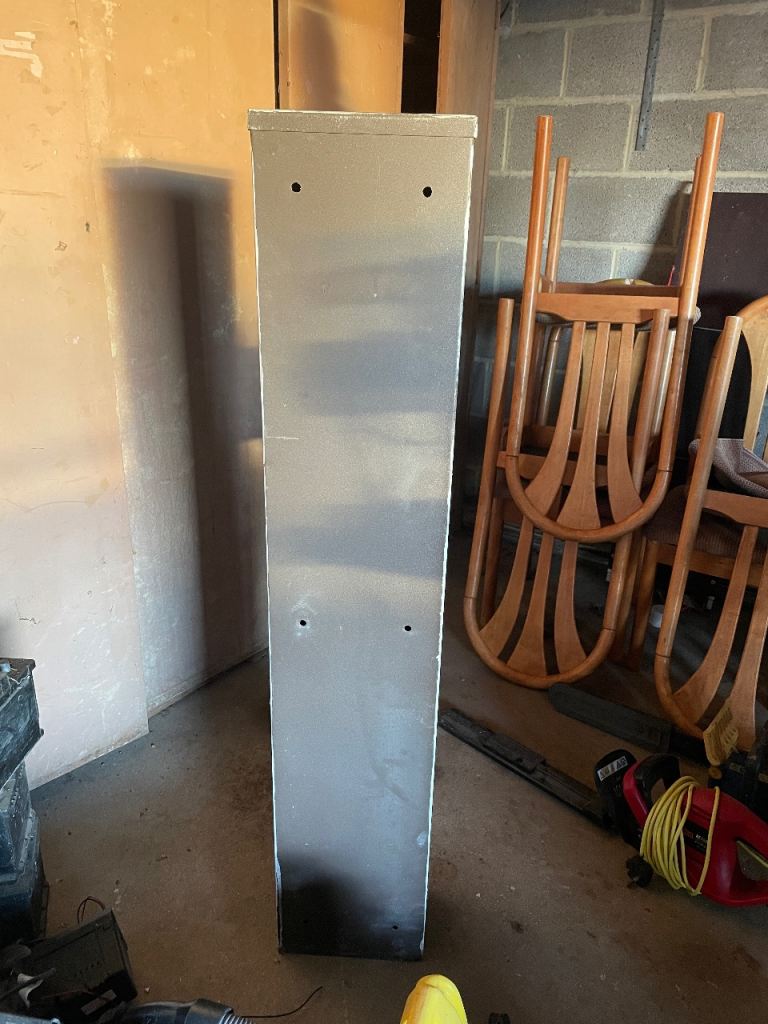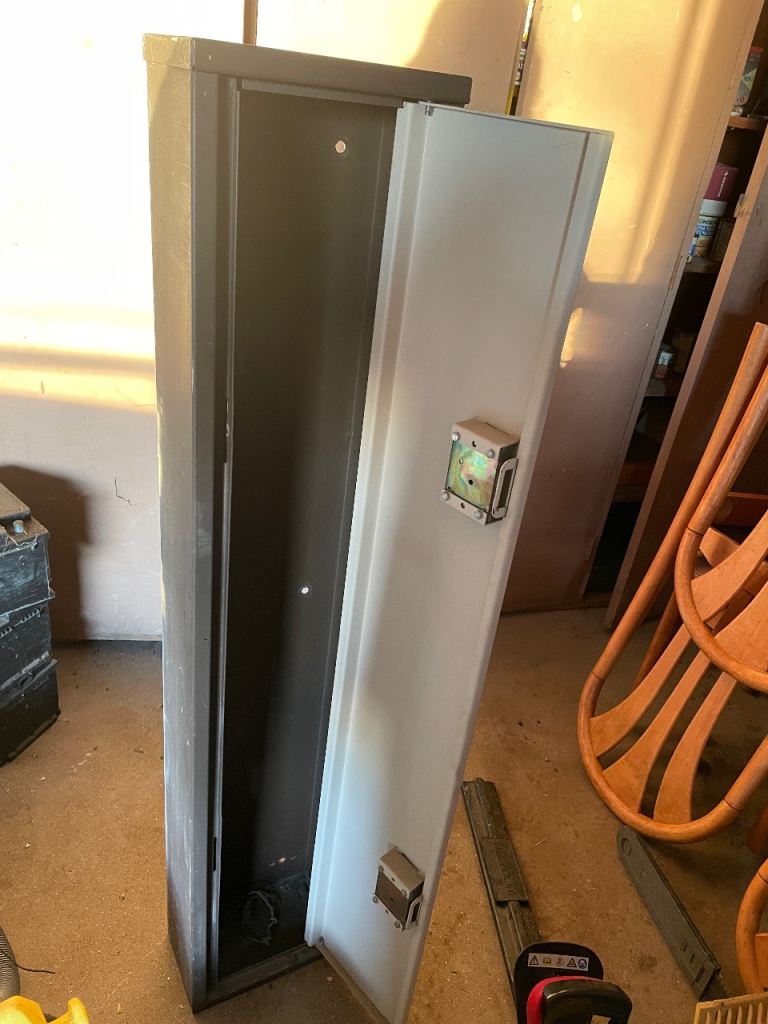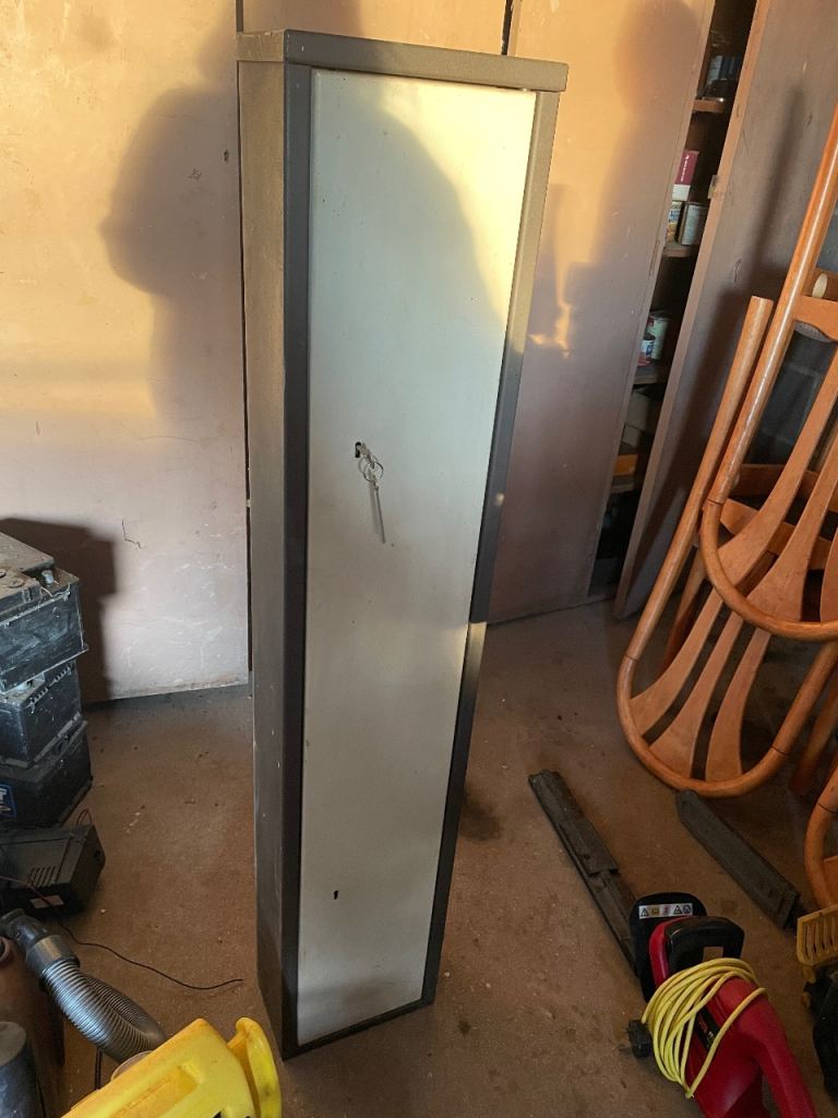 Gun cabinet H130, W25, D16. Holds 2 rifles. Good condition. Holes on back so can be bolted to a wall. 2 key lock door.