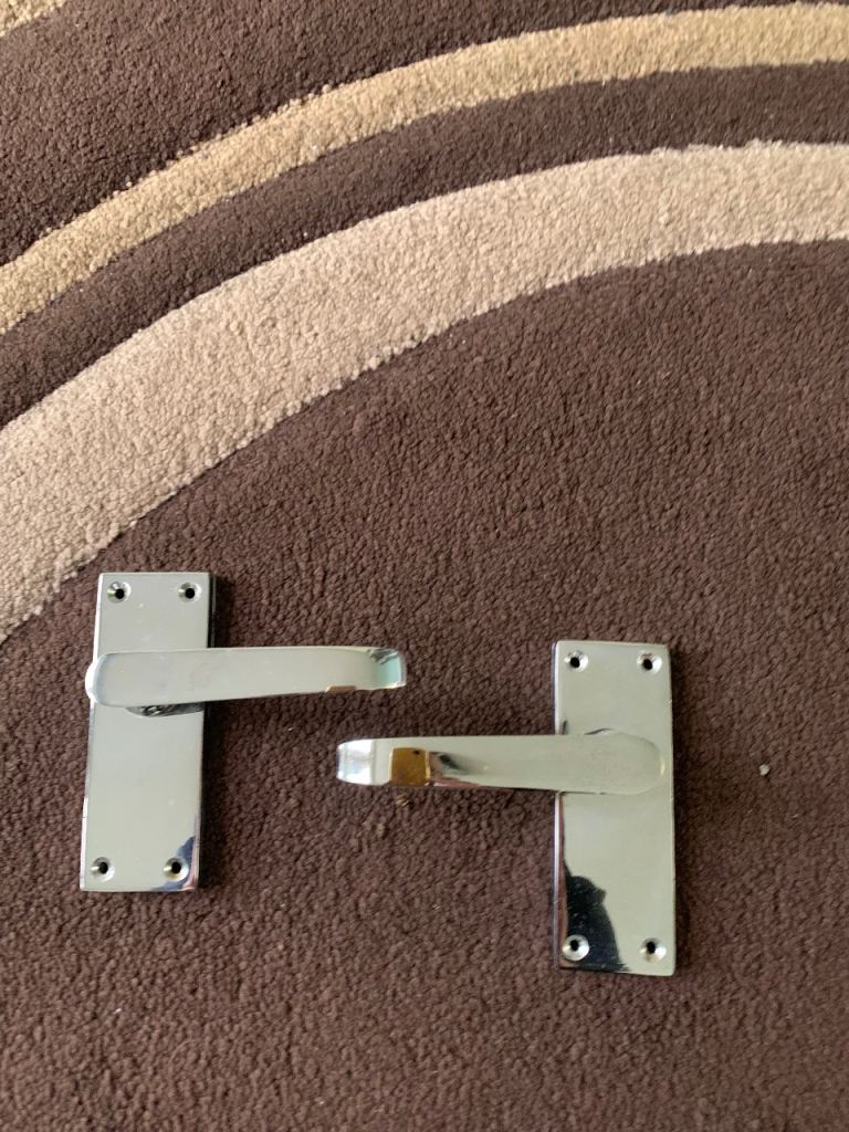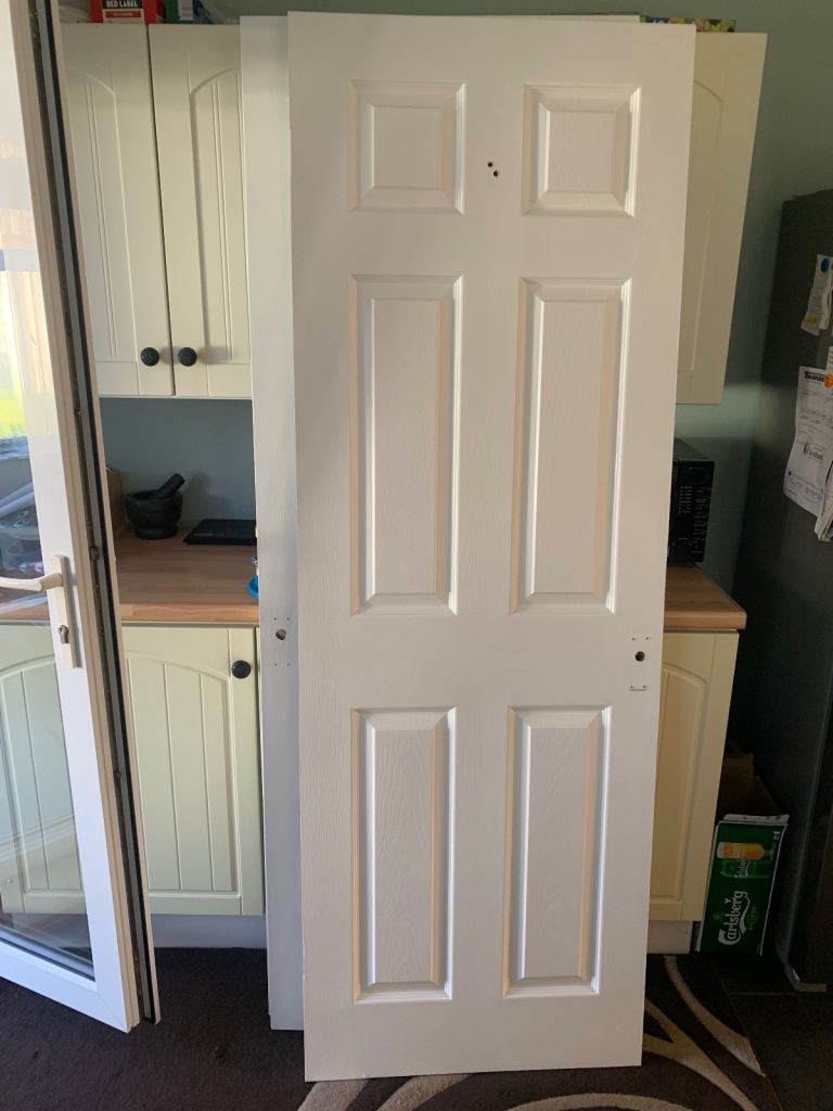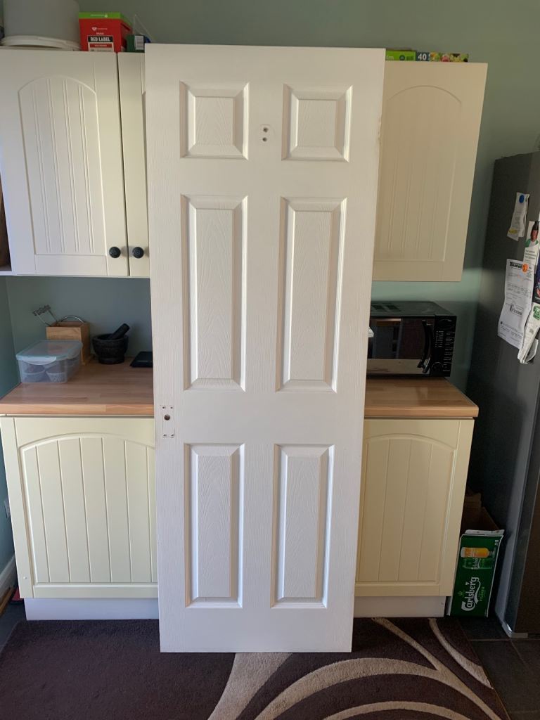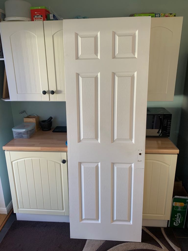 White wooden doors three in good condition one needs attention, handles included.