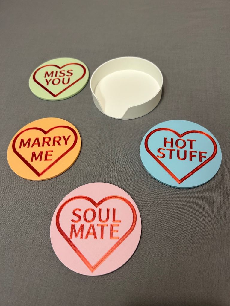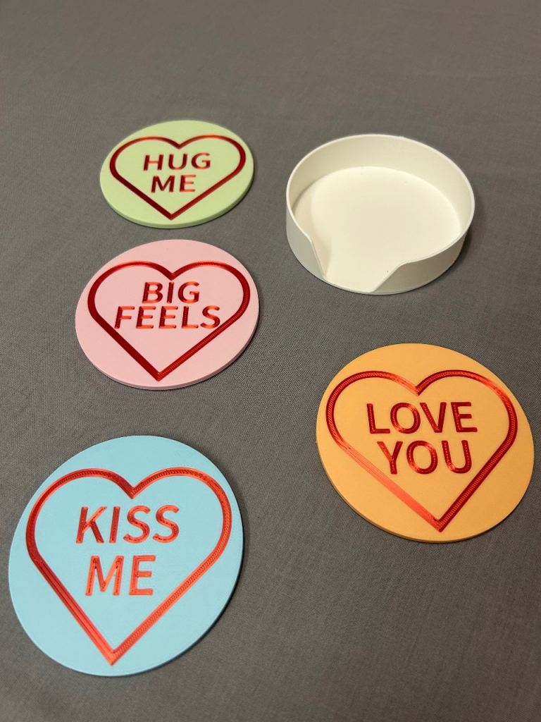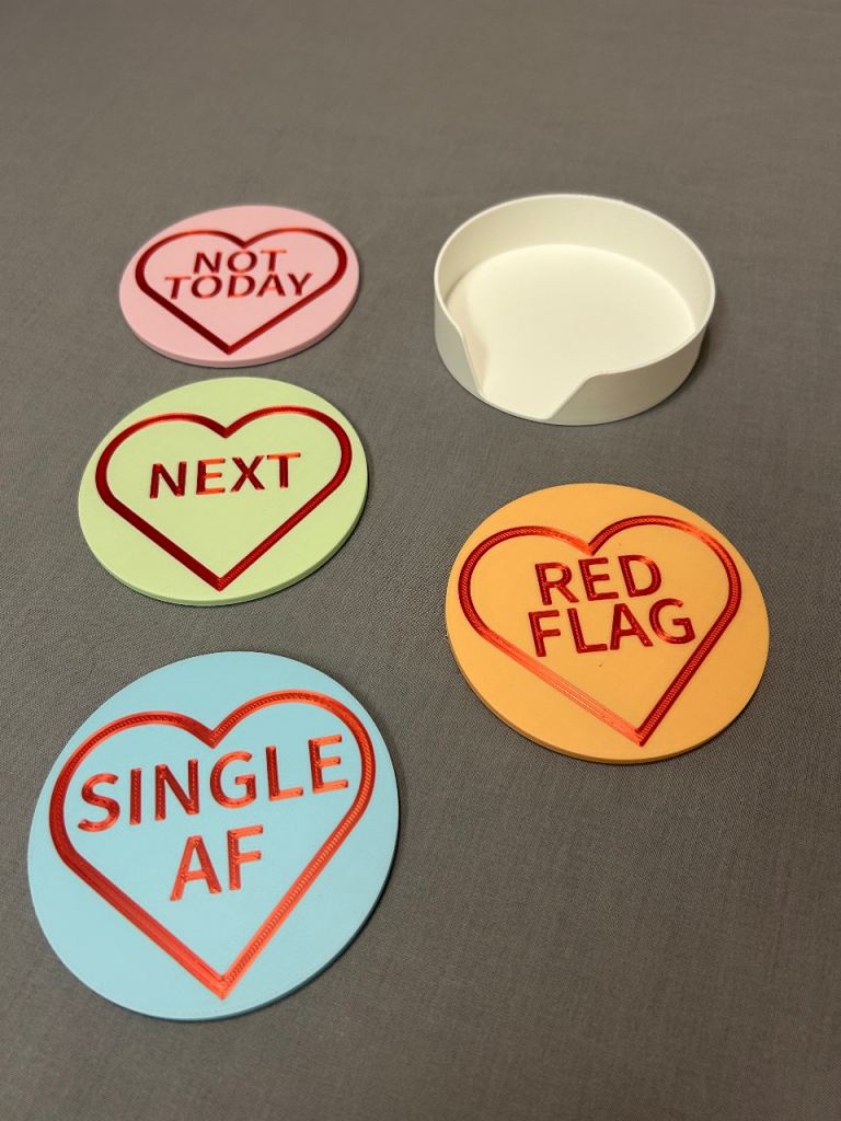 Add a little humour, love, or attitude to your table with our 3D-printed Love Heart Coaster Sets finished with natural cork backing to help protect surfaces and improve grip – inspired by classic sweet hearts, but reimagined with modern phrases and custom options. The photos are examples of the set you’ll receive, each of your coasters will be personalised with your message/text.