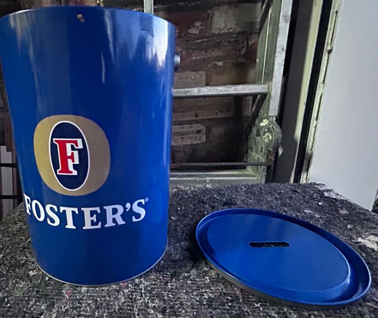 For sale a blue Foster money saving tin with the logo on it and it’s for sale for only a fiver (£5)