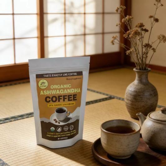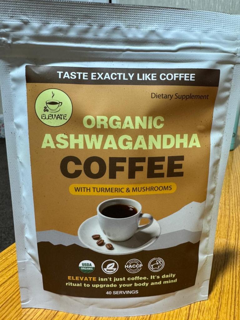 Elevate by m KSM-66 Ashwagandha Coffee is a 100% organic and natural instant coffee with the hint of turmeric and mushrooms providing a smooth coffee-flavored beverage.