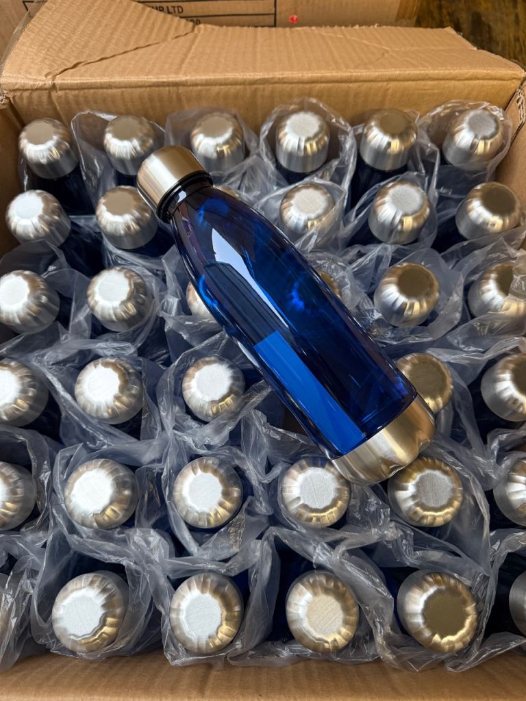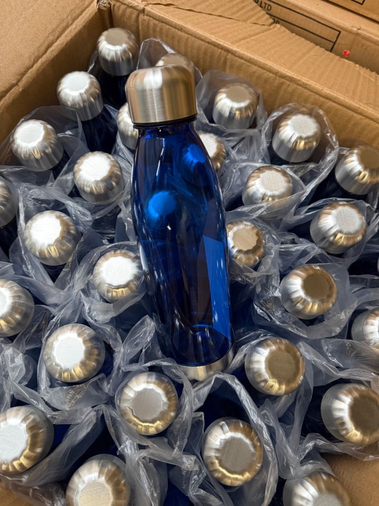 Pallet lot of 828 ( 23 boxes of 36) blue 700ml plastic water bottles. Ideal to personalise / print onto / customise etc. Great quality.