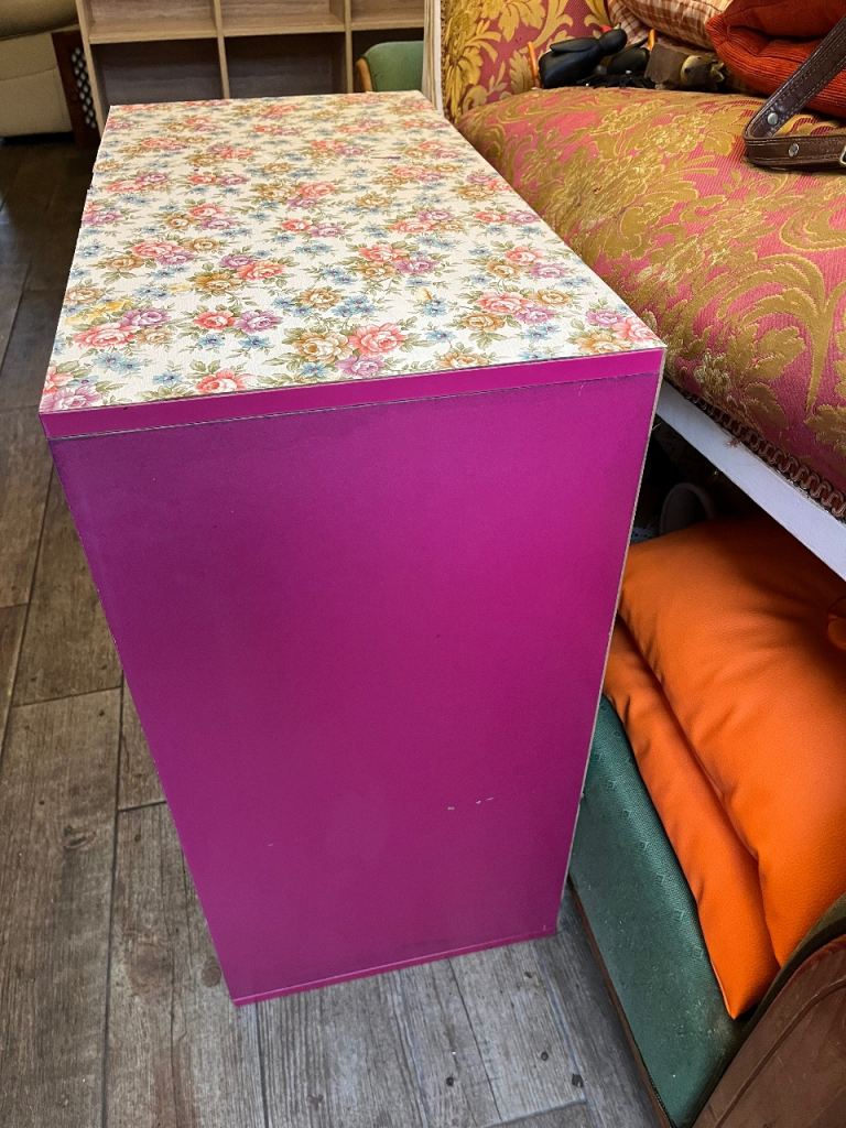 Decorative storage cube with floral sides and pink bins featuring heart and letter designs.