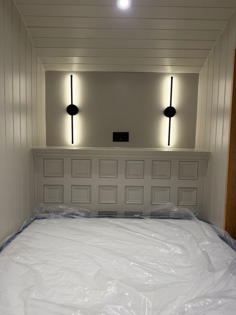 • Cozy sleeping area with feature lighting and panelled detailing