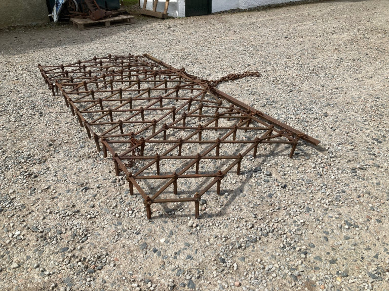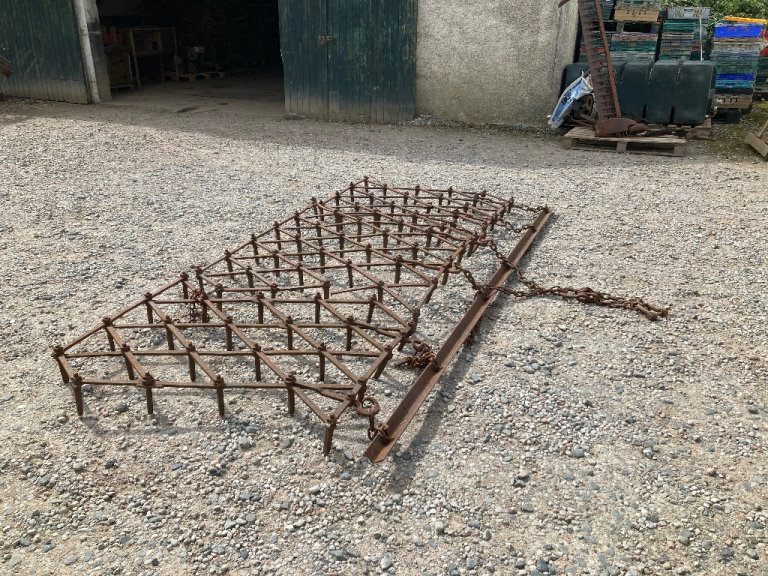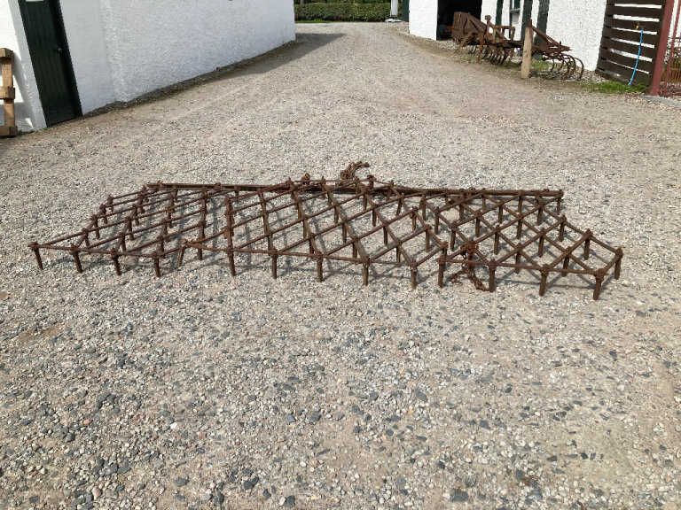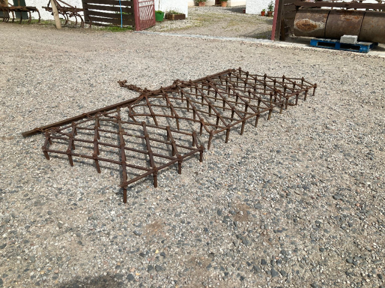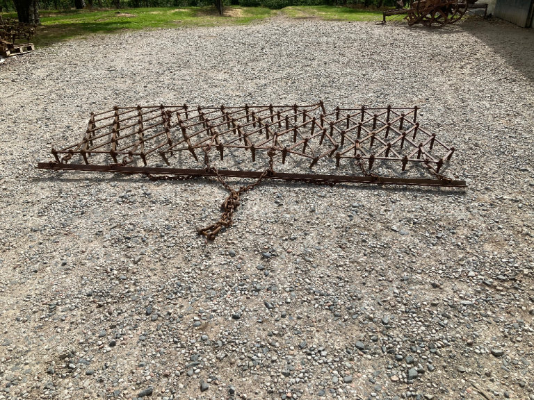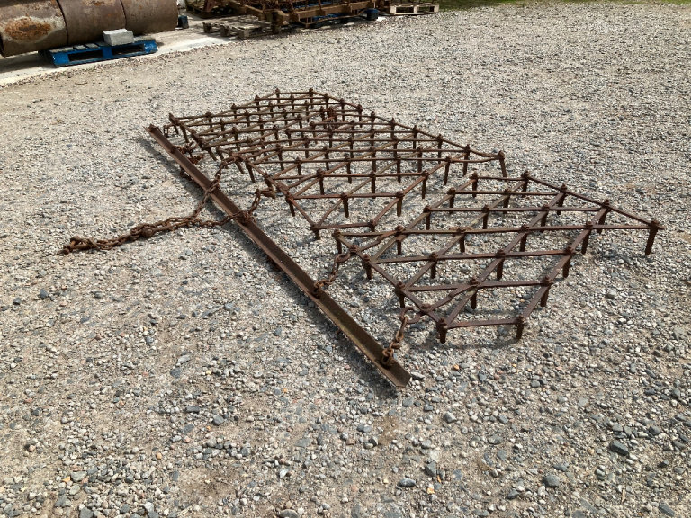 Five section tractor trail pin Harrow in good condition.This 5section trail pin Harrow is 12 feet wide when harrowing .Good tight Harrow pins and complete with towing bar.