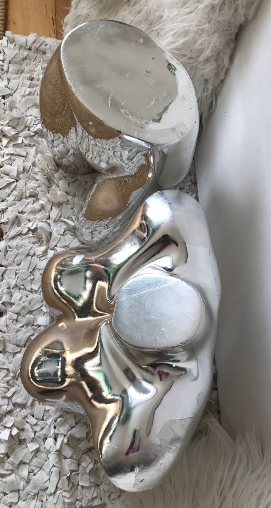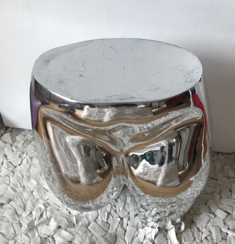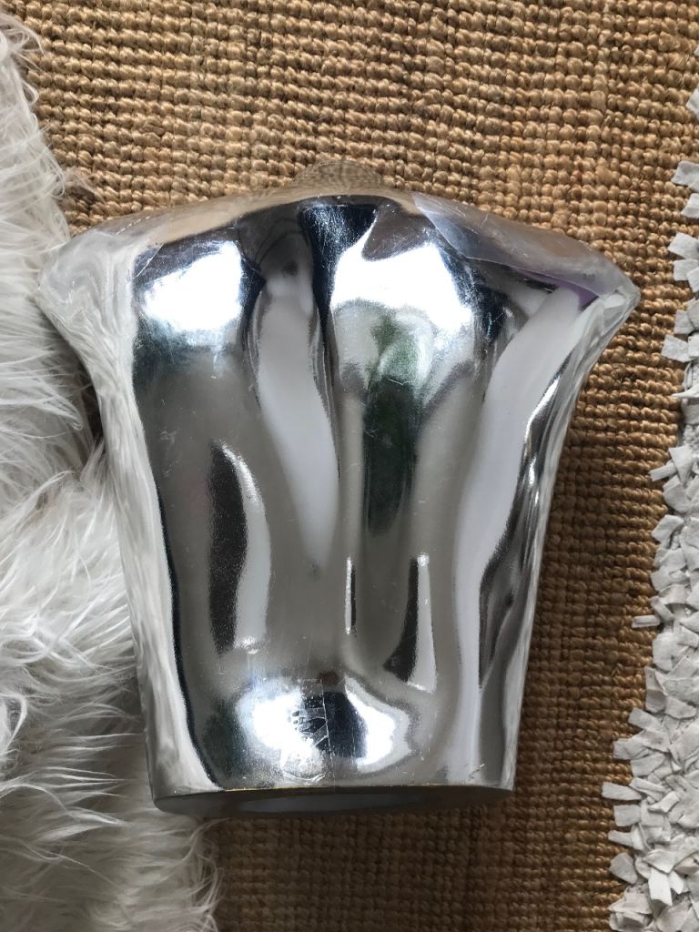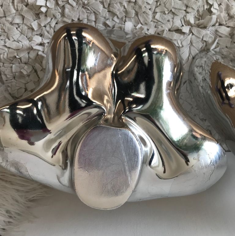 A retro chrome coloured mannequin with 1980’s Y2K sculptural vibe.
