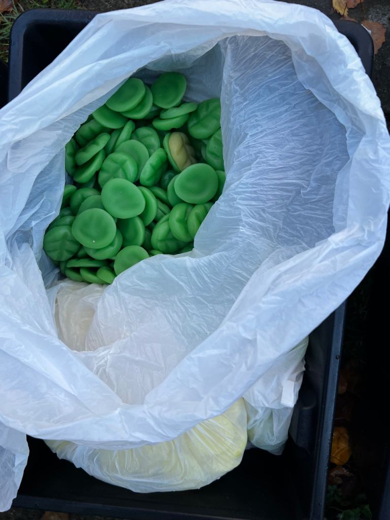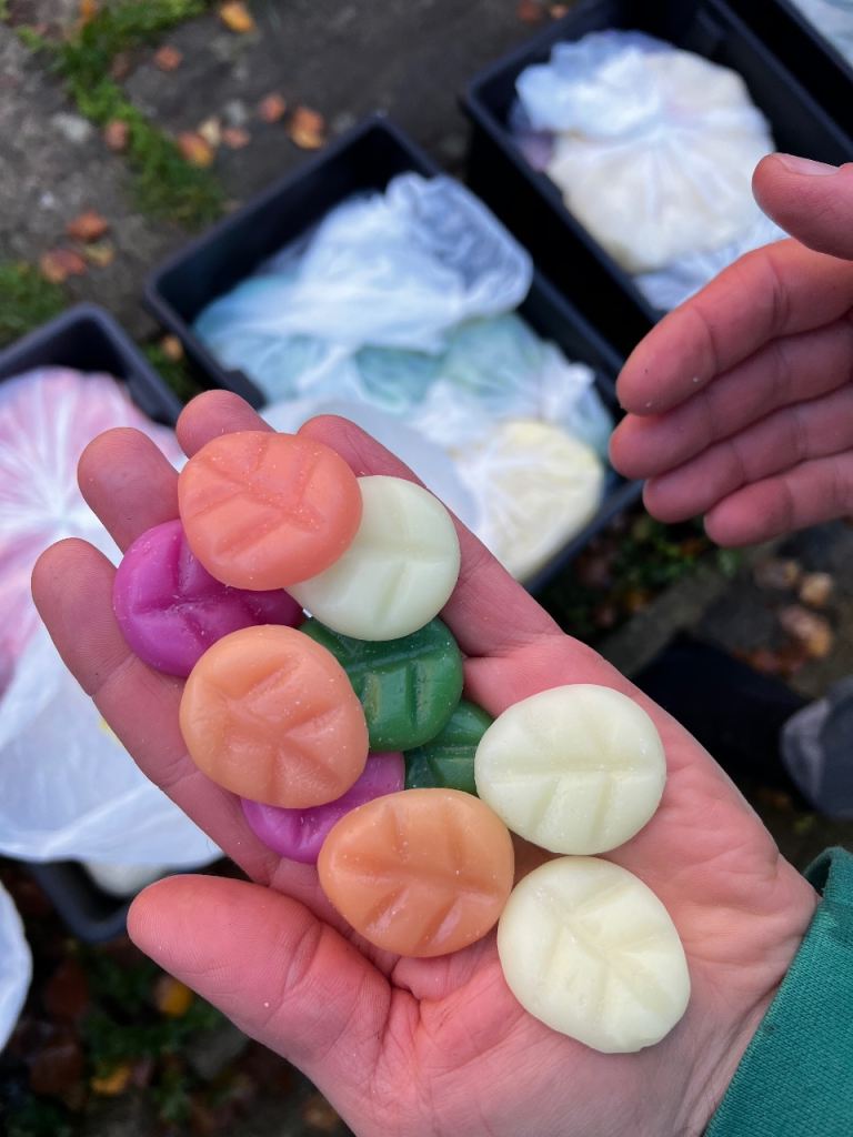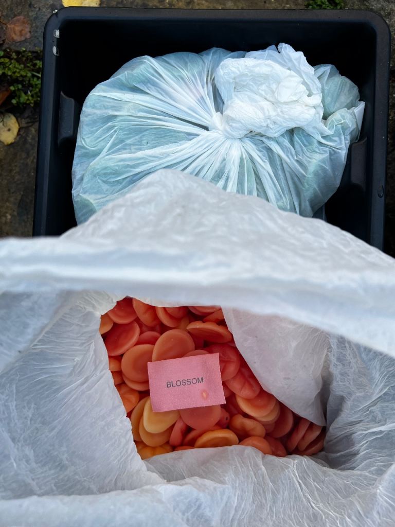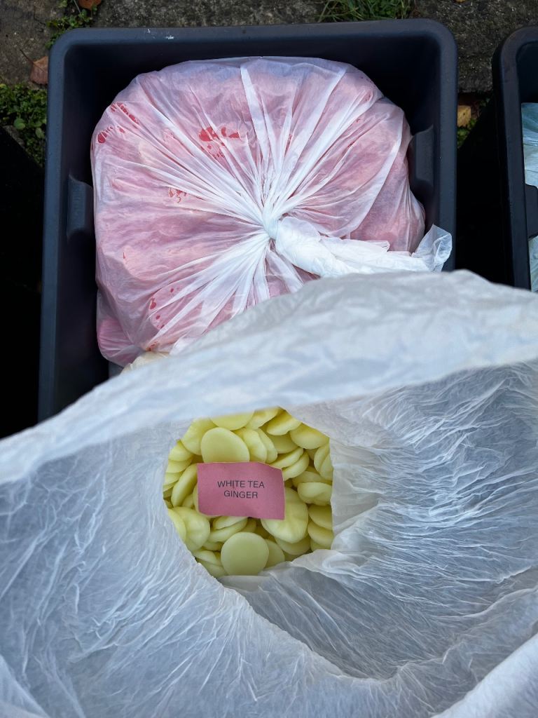 🕯️ Selection of scented wax melts in various colours and fragrances, including 'White Tea' and 'Blossom'.