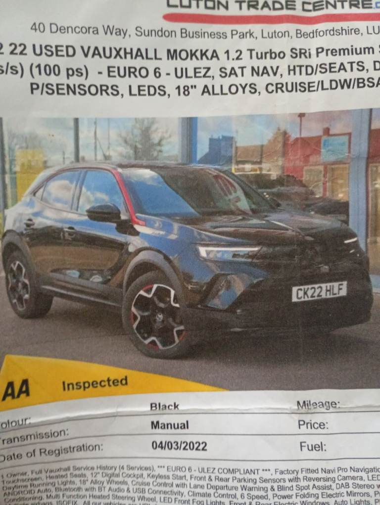 Details show it has a manual transmission, was registered on 04/03/2022, and runs on petrol.