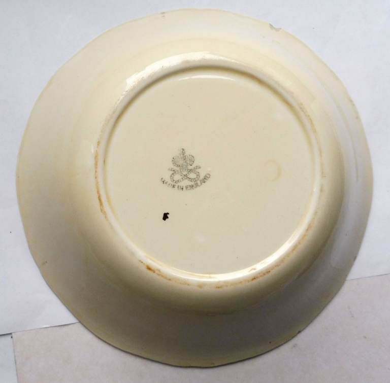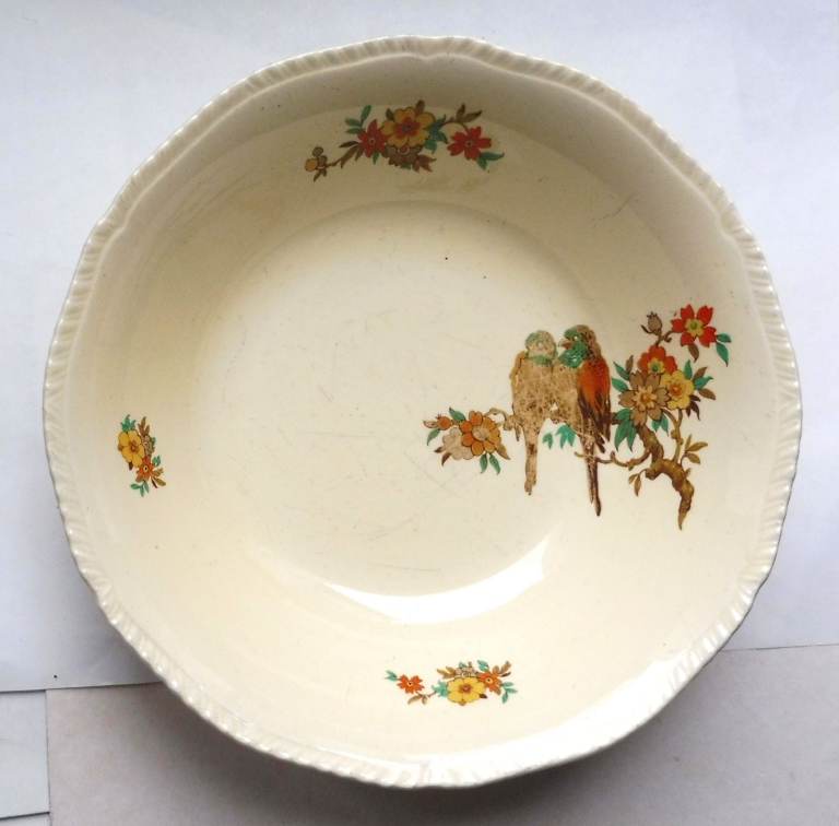 Art Deco 1930s fruit bowl with Staffordshire knot mark, parrots design.