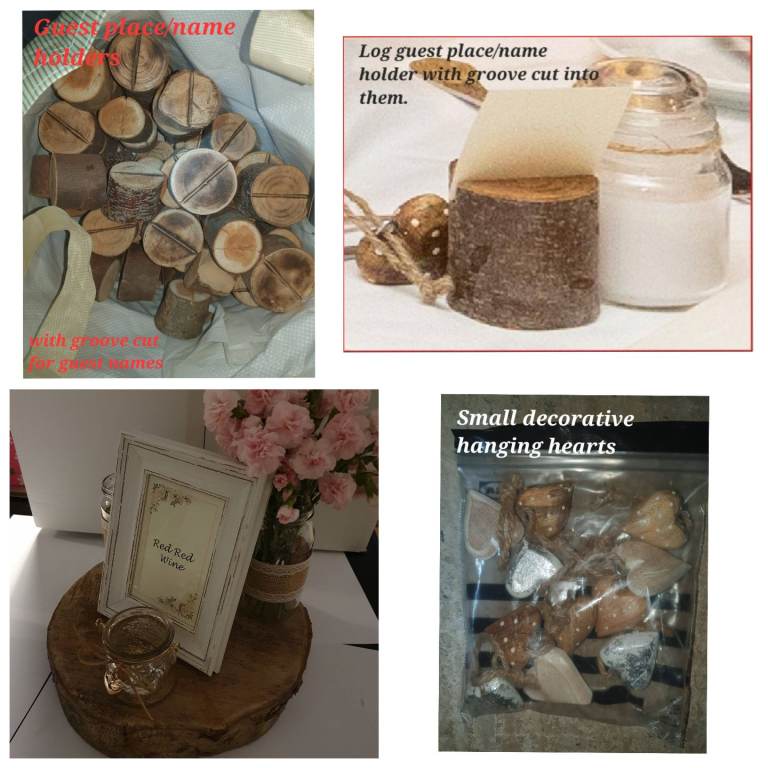 Small log guest place/name holders. With grooves cut into them to hold name tags (x69).