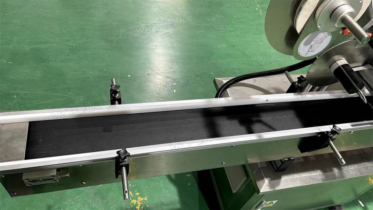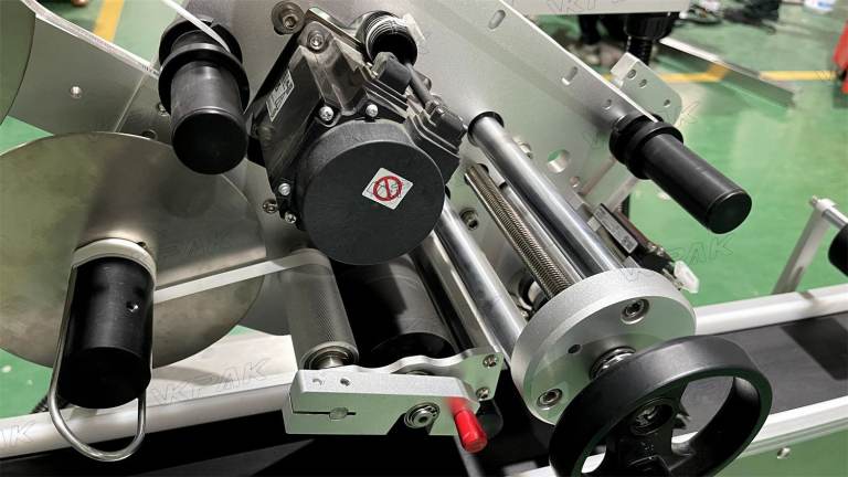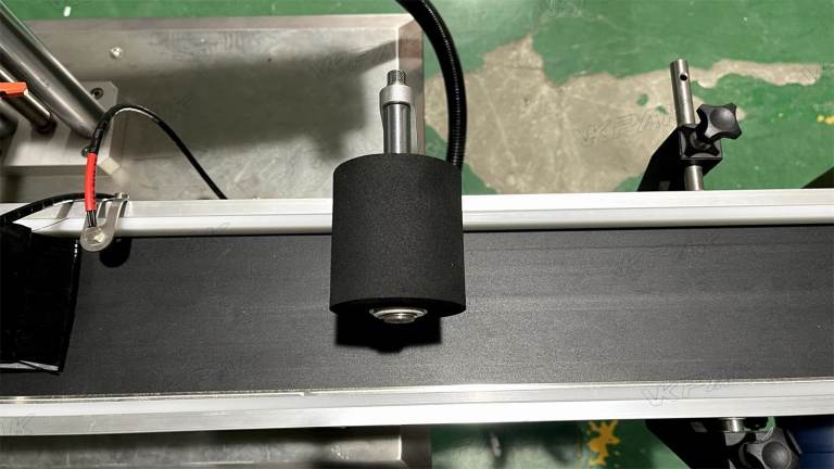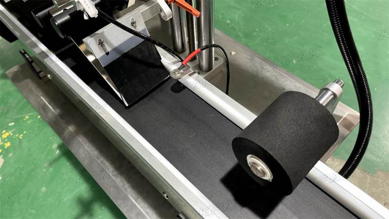 The labeling machine is designed for top side labeling. It is suitable for sticking labels on flat surface like bottle caps, pouch. The brush can ensure there is no bubble under stickers, improves production quality.