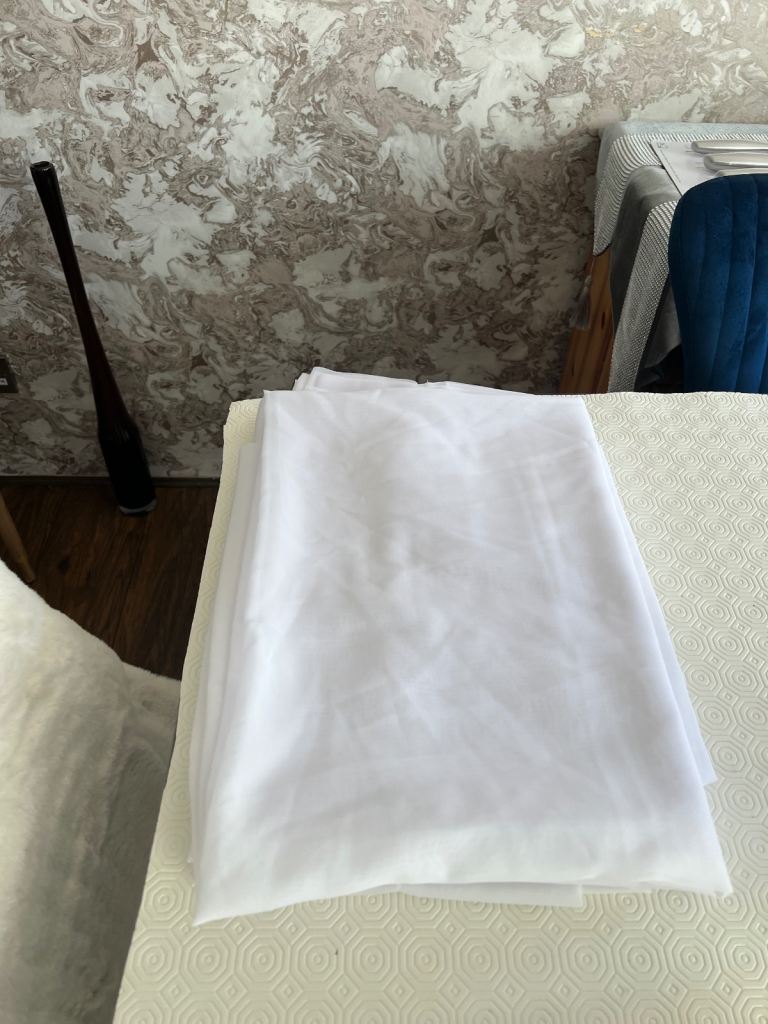 3 white nylon curtains hemmed at top and bottom (can be used as large table cloth (60” wide / 120” drop)