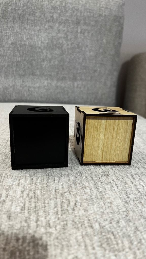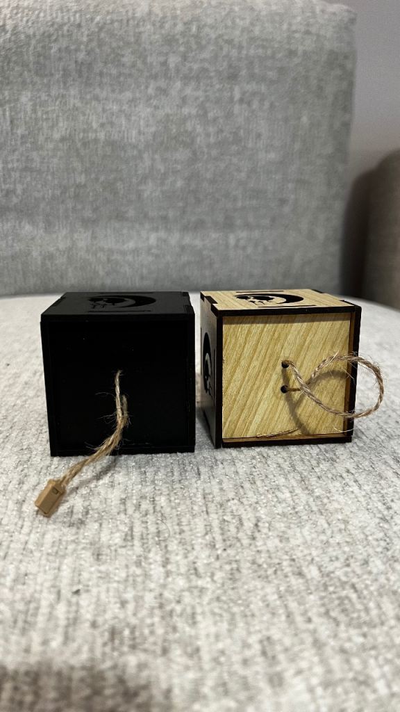 One black, one natural wood finish, with moon and star cutouts.