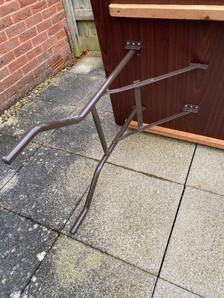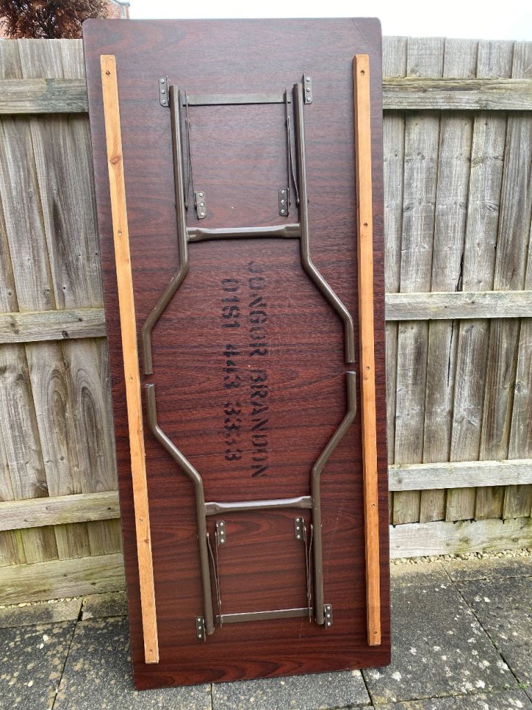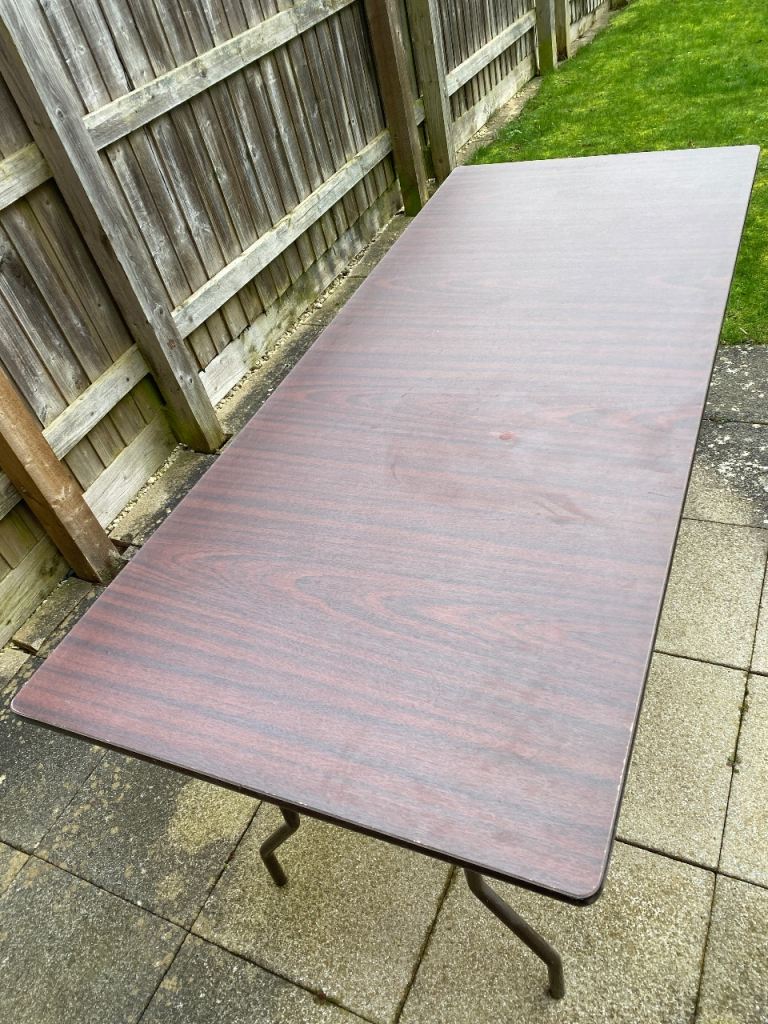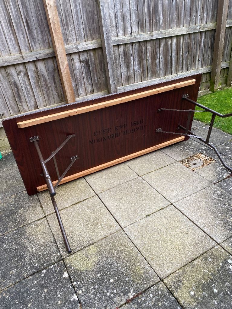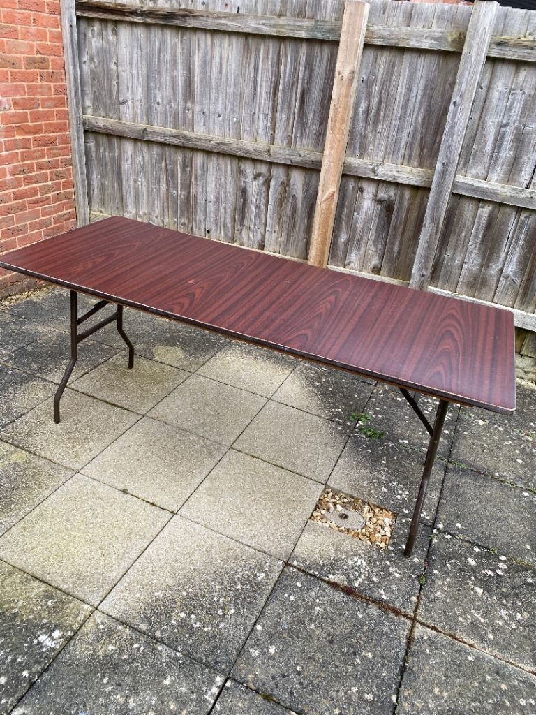 Wooden trestle table. Very substantial table and very heavy. Age related marks but no damage. 6ft x 2.5ft.