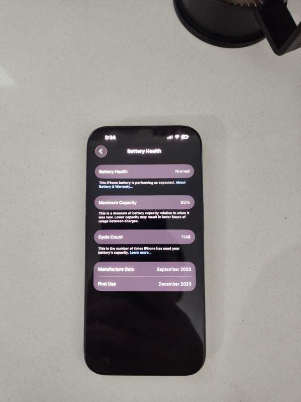 Great condition. 128GB iPhone 15 pro in Titanium blue, comes with the box it was purchased in and battery health is normal at 83%. Casing cameras and screen are all virtually immaculate and is performing well. Purchased from new in Dec 2023