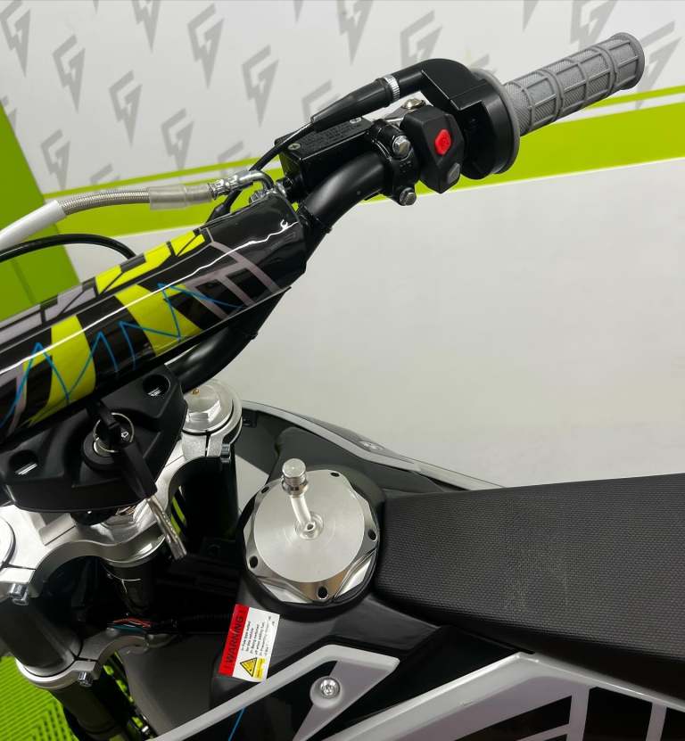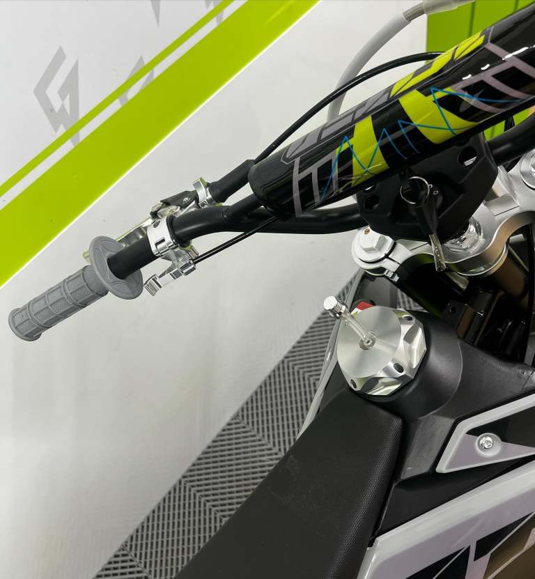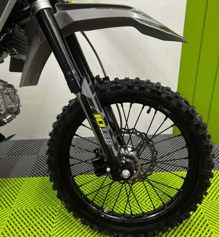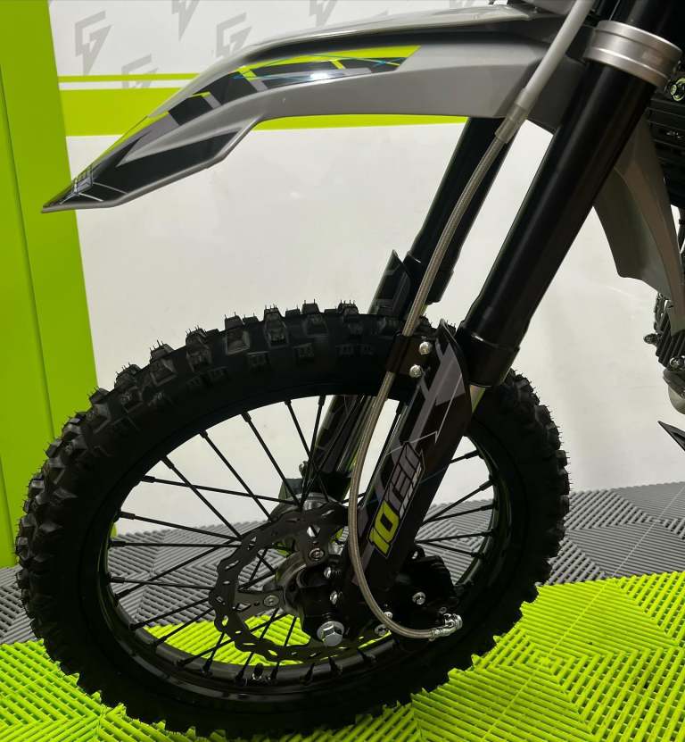 The 10Ten 140R combines power, style, and control for serious off-road riders. With a tall seat and high-rise handlebars with high-rise clamps, this bike ensures comfort and precise handling across rugged terrain. The power bomb exhaust and race aluminium silencer amplify performance with an aggressive sound, while the convenient electric start gets you going with ease. Featuring bold black rims with chrome hubs and race footpegs for extra grip, the 10Ten 140R is built for those ready to dominate the dirt.