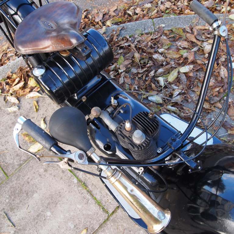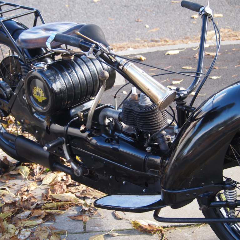 He came up with an unusual machine that was constructed more like a car than like a motorcycle; it had no frame but a chassis made of beams, 221 cc two stroke engine, friction drive and hub-centre steering.