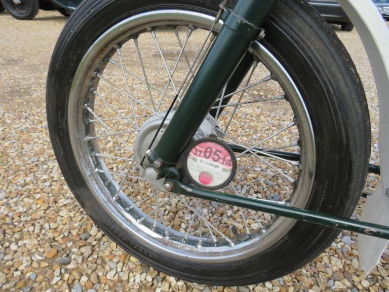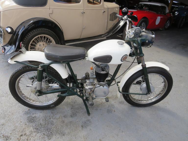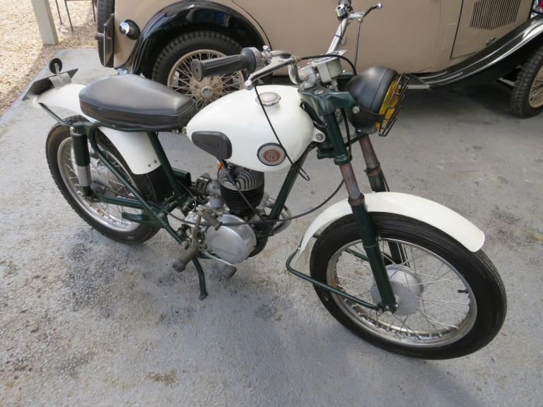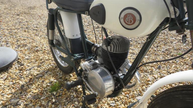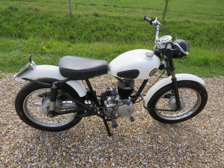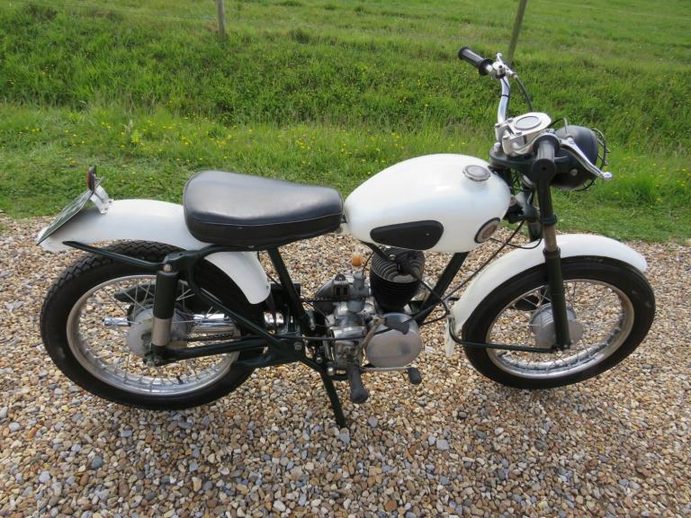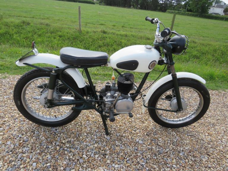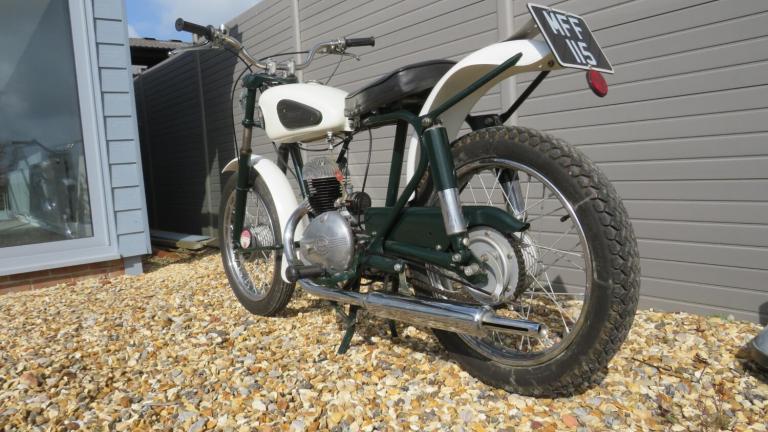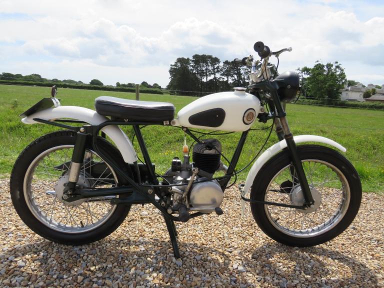 A cool period bike , finished in gleaming white , black seat , a great item love it . see movie att of it running . with that great two stroke ring . ting ting .please copy and paste on to the search bar for a movie of it running [Website URL removed]