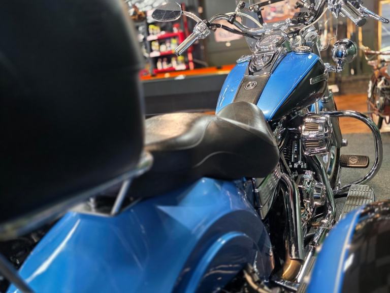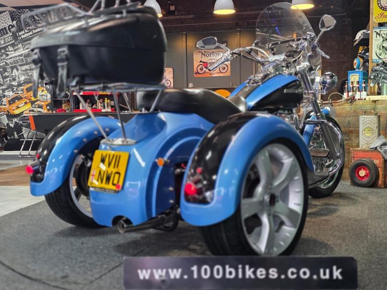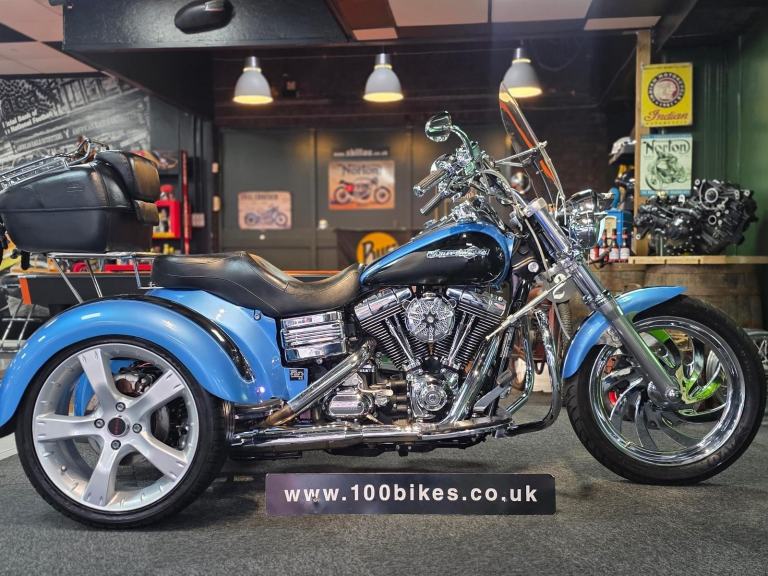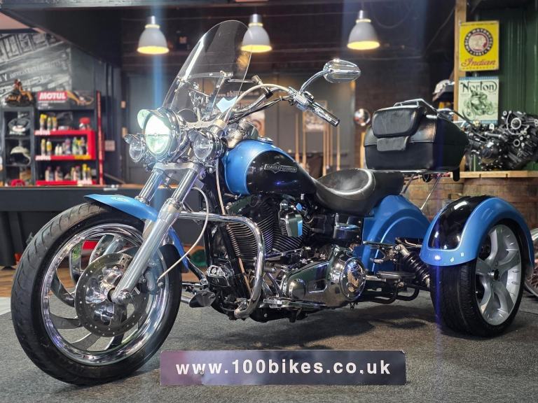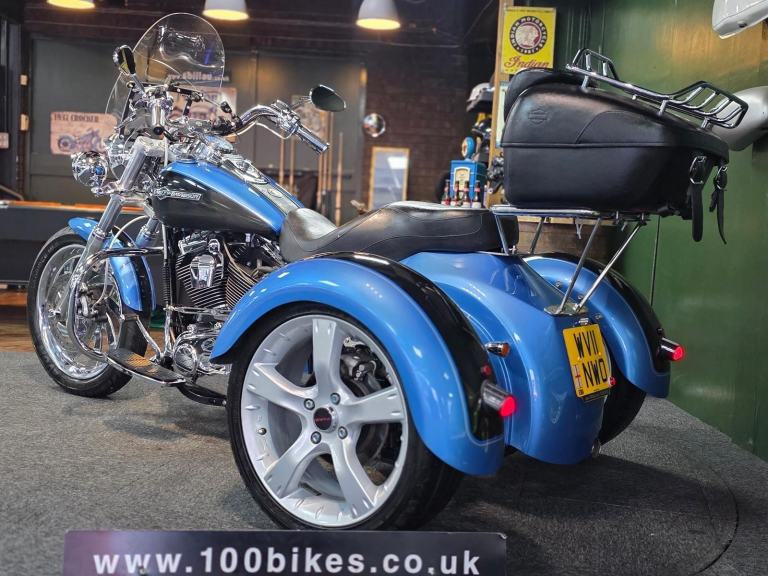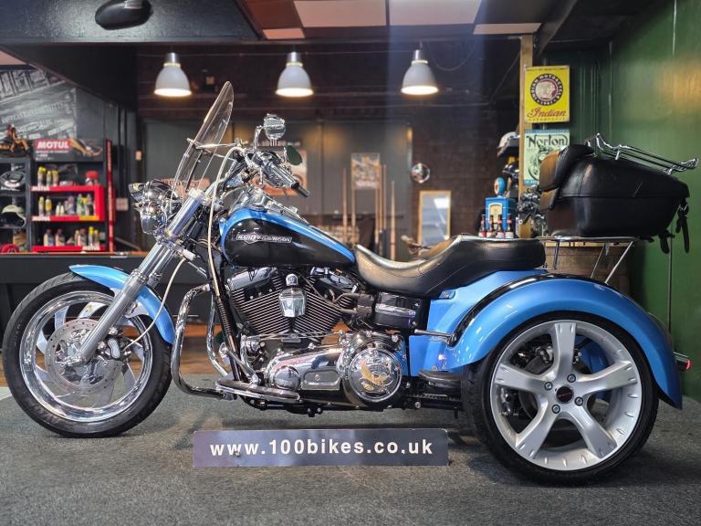 2011 Harley-Davidson Super Glide Trike in Blue Two Tone Metallic with 6,400 Mile's. Top Notch Conversion by Trikeshop with Independent Rear Suspension, Mechanical Reverse Gear, Easy Steer, Chrome HandleBar Controls, H-D Leather Top Box with Rack, Air Cleaner Upgrade, Upgrade Mirrors with Integrated Indicators, Chrome Front Wheel, Steering Damper, Crash Bars, Screen, Lights Upgrade... £15,995