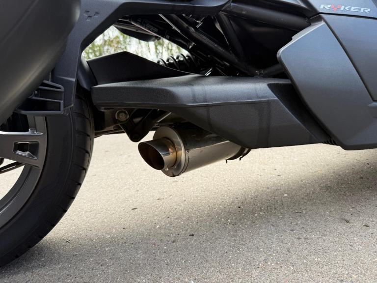 2021 Can-Am Ryker 600 in black fitted with heated grips , belly pan protector, max mount, rear seat , shad rack, pannier and upgraded exhaust.