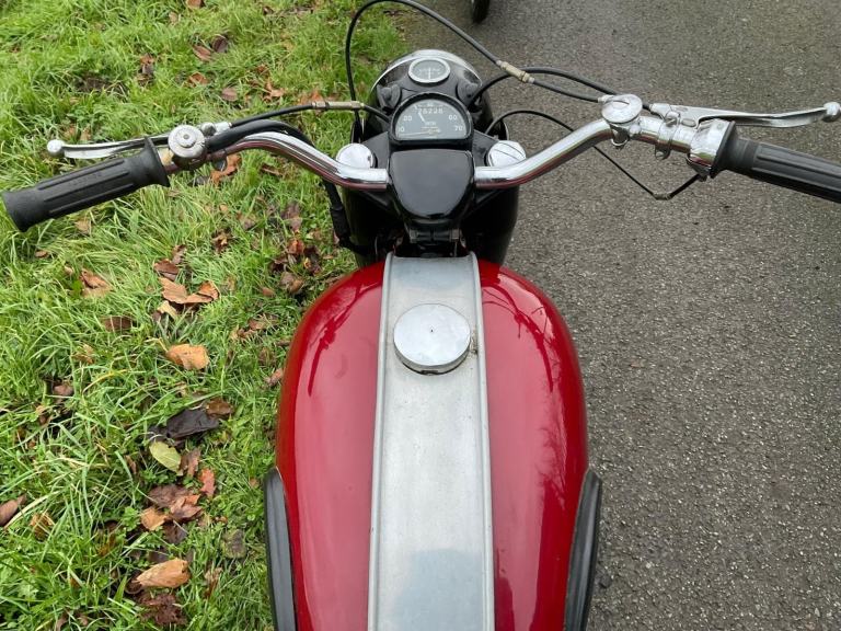 We have for sale a 1959 Ariel Colt, an older restoration that remains in tidy, presentable condition. The bike starts easily and runs well, though it has not been used on the road for around 18 months, so a basic safety check and recommissioning are advised before regular use. It is fitted with its correct single-cylinder Ariel engine. Paintwork and general chrome show some ageing, but the wheel rims retain good, bright chrome, giving the bike a clean overall appearance.