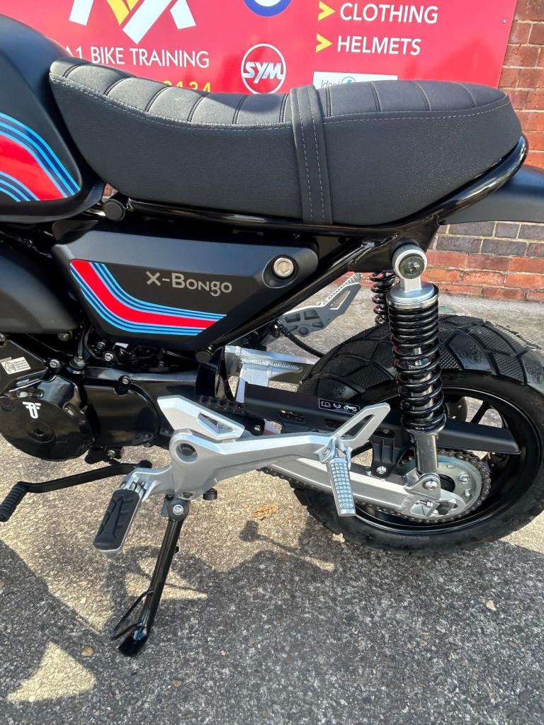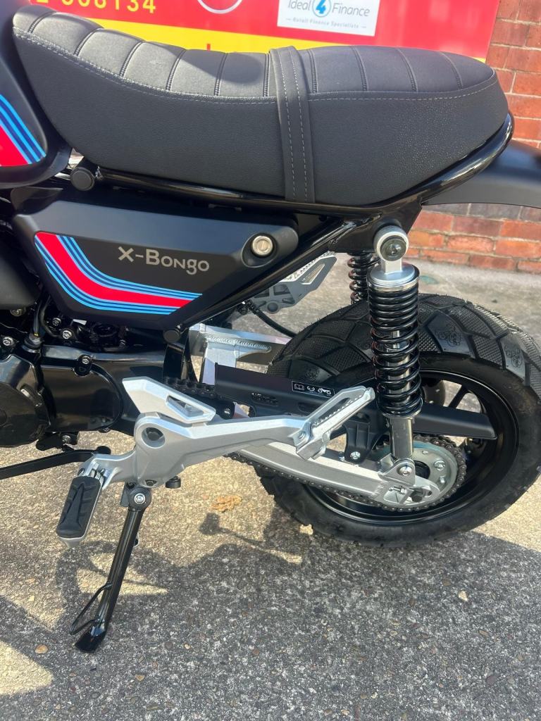 The X-Bongo 125 also stands out for its exceptional maneuverability, aided by its low weight and low seat. It is very reassuring to handle, whether in urban traffic or on winding roads. Its compact size and tight turning radius make it easy to weave through crowded streets. The front suspension with inverted forks and the rear with dual shock absorbers combining hydraulics and springs ensure optimal shock absorption and excellent riding comfort, even on rough roads.