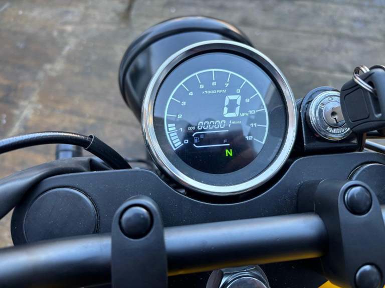 Coming back from there, in front of the rider sits a large, classic Brit-bike-inspired fuel tank, which meets a padded bench seat, suitable for both a rider and pillion. A chromed grab rail and minimalist rear light complete the look.