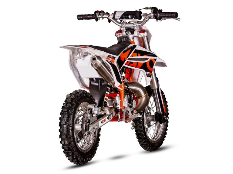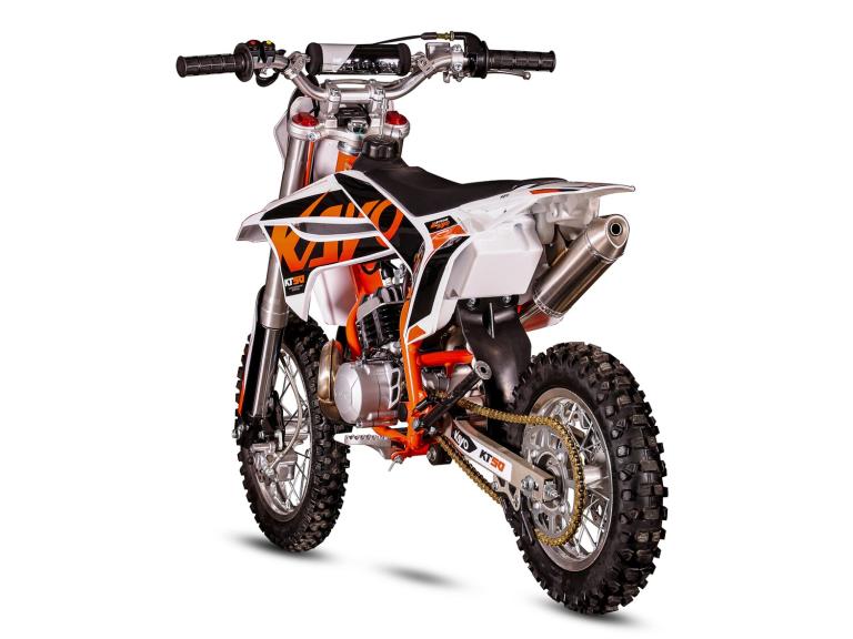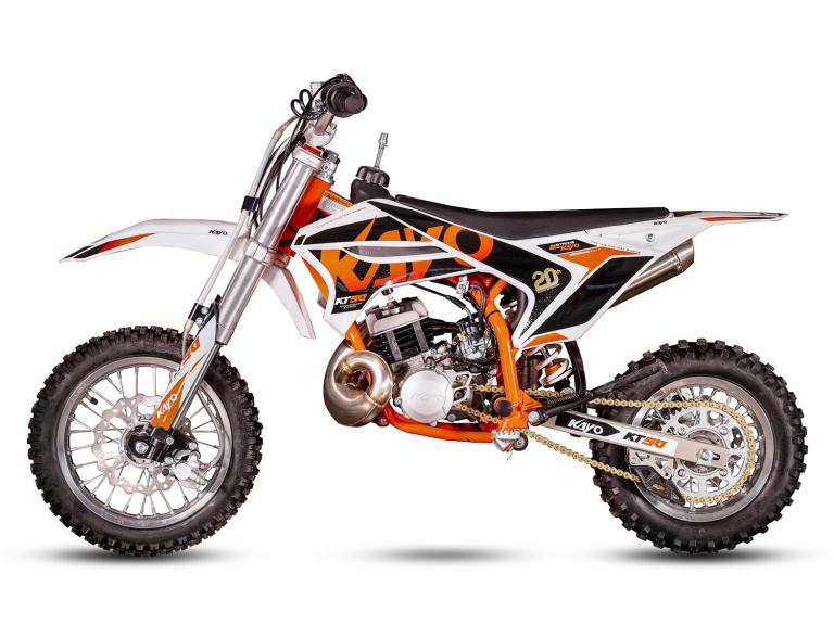 KAYO KT50 MINIBoasting a screaming 50cc air-cooled 2-stroke engine with a tuned stainless expansion chamber, the KT50 picks-up on its auto clutch, roosts the dirt and takes off. The perfect entry level machine to start racing or simply to chase dad around the practice track. Until now the options for kids MX have been somewhat limited without a decent offering in the midrange price bracket.The KT50 changes that putting a super-quality, high-performance bike in reach of those who want to have a go at motocross, but who are simply not ready to invest the big money. Available in 12/10 or 14/12 inch wheels, the bike can be selected to suit the size of the young rider. Add the genuine Dellorto race carb option to get the most out of that engine. The KT50 also features both electric and kick start to make life easier for the little ones. Weight is kept down to a minimum by utilizing a 4130 chromoly main frame, alloy swing arm, 7-series heat treated alloy rims and a lithium-ion battery. The KT50 has been carefully considered by our engineers to be exactly what you are looking for to get your youngsters out on the track and a price that will make you smile. PICTURES FOR DEMONSTRATION PURPOSE ONLYColours and specification are subject to change without noticeDelivery available this excludes Highlands, Islands, Northern Ireland etc ( shipping is available but please call with location for a quote )Can be assembled for